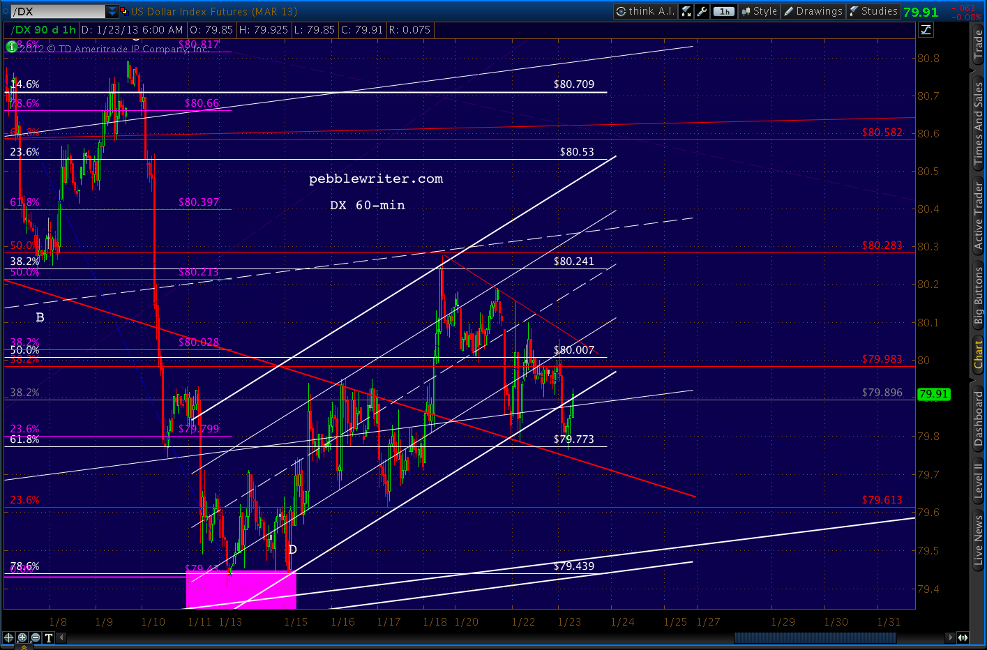 If 1520 is exceeded, then we’ll look at the next higher grouping: 1553-1555. This “group” is basically the two yellow 1.618’s. Again, the larger pattern’s 1.272 had no influence on the market. The smaller pattern’s 1.272 is the one coming up at 1519.