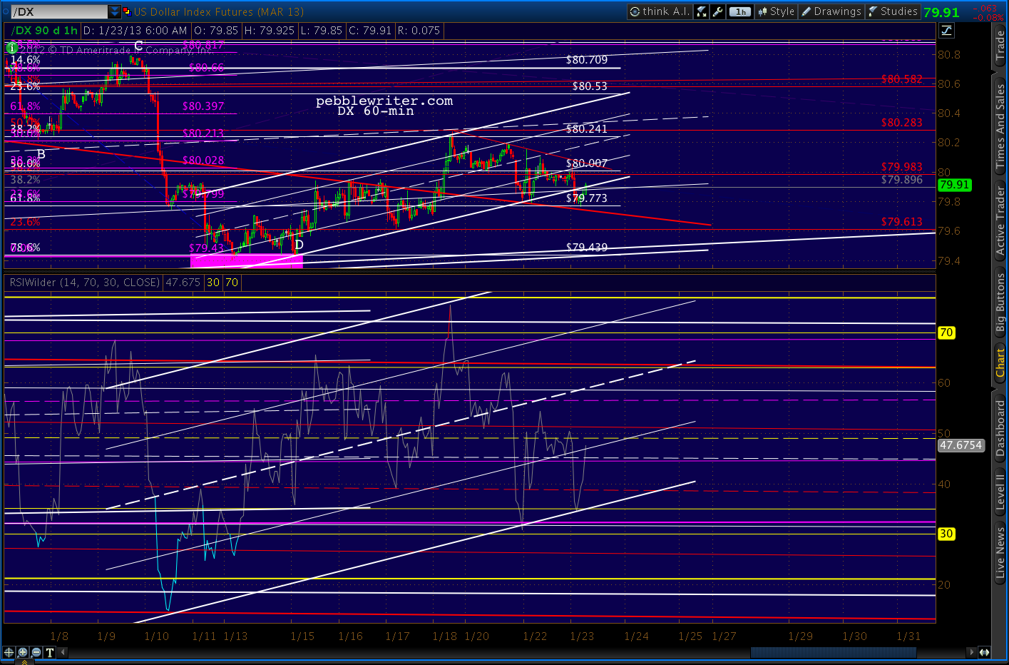 I won’t rehash the stuff already posted in the past couple of weeks. Just take a look at the rising wedge that would be confirmed by a reversal at 1510 as early as tomorrow. The target would come at the .886 of the base to apex price range and .618 of the time range (almost too good to be true.)