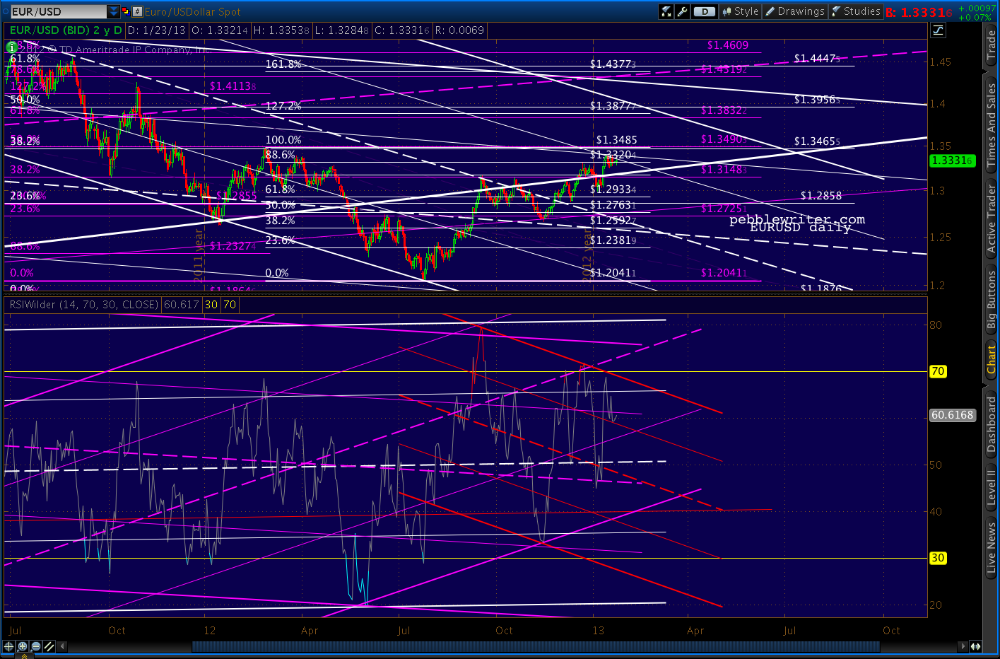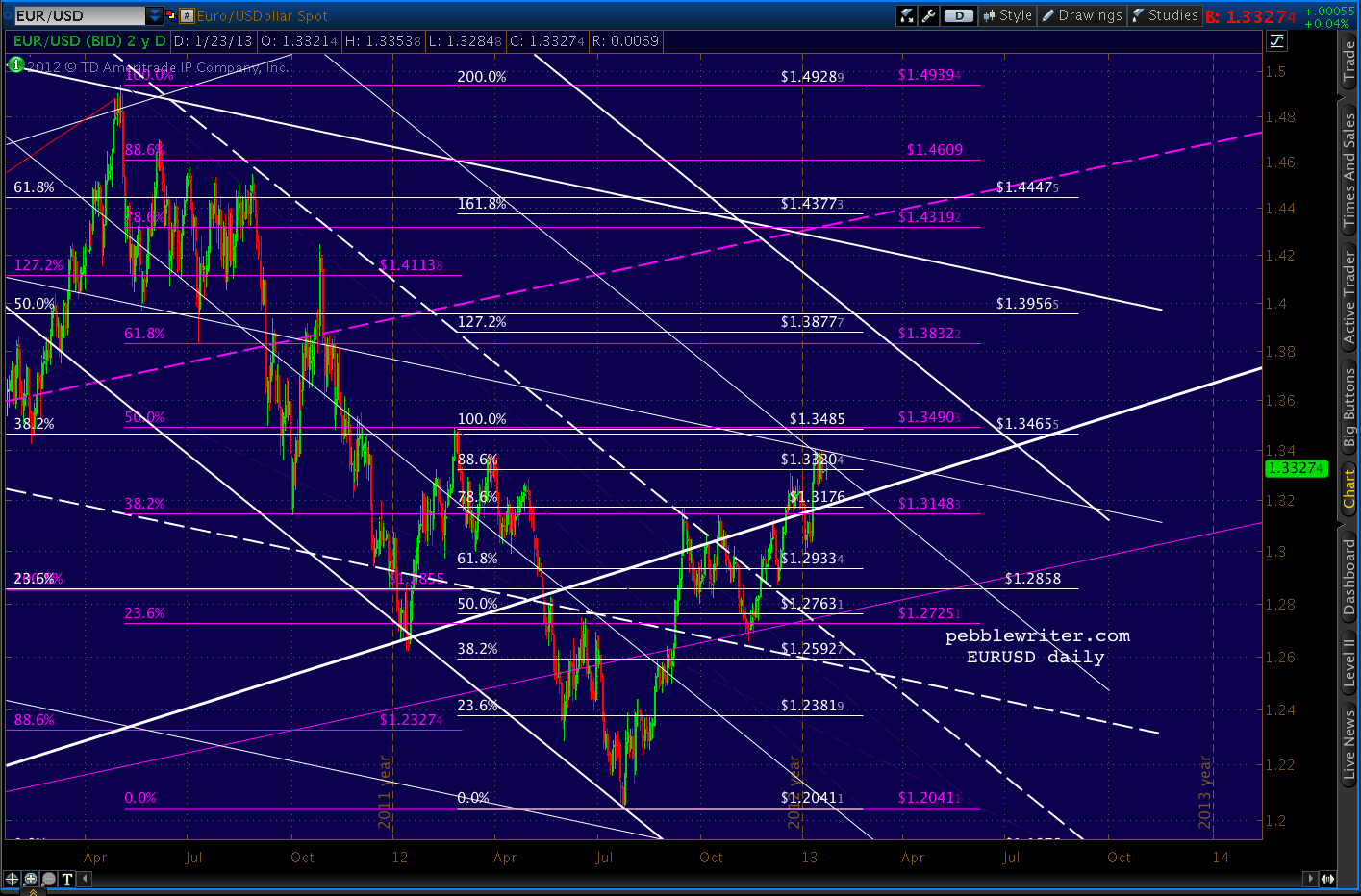 The EURUSD continues to levitate, but still hasn’t broken the last important interim top put in on Feb 24. It is also bumping up against two 25% channel lines, so could very well stall out here at the .886.