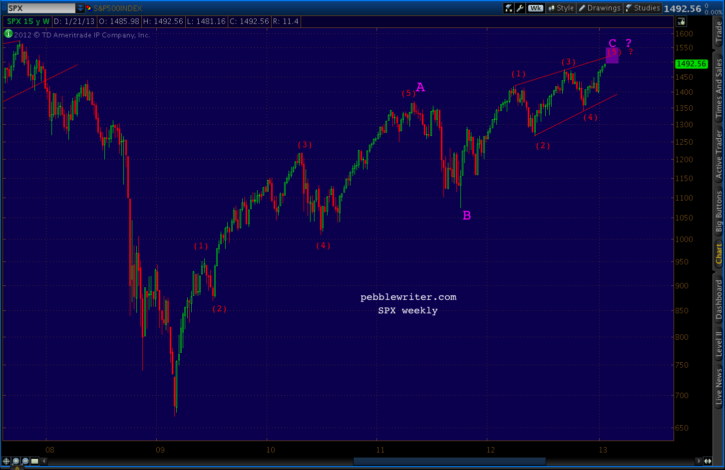 My secondary goal is slightly higher at 1553-1555, so there should be opportunities to jump back in and capture most of any upside above 1520 if/when appropriate. Such a move would likely follow a reversal from 1509-1515 back down to 1474ish and would constitute a fifth wave rather than the ending diagonal suggested above.