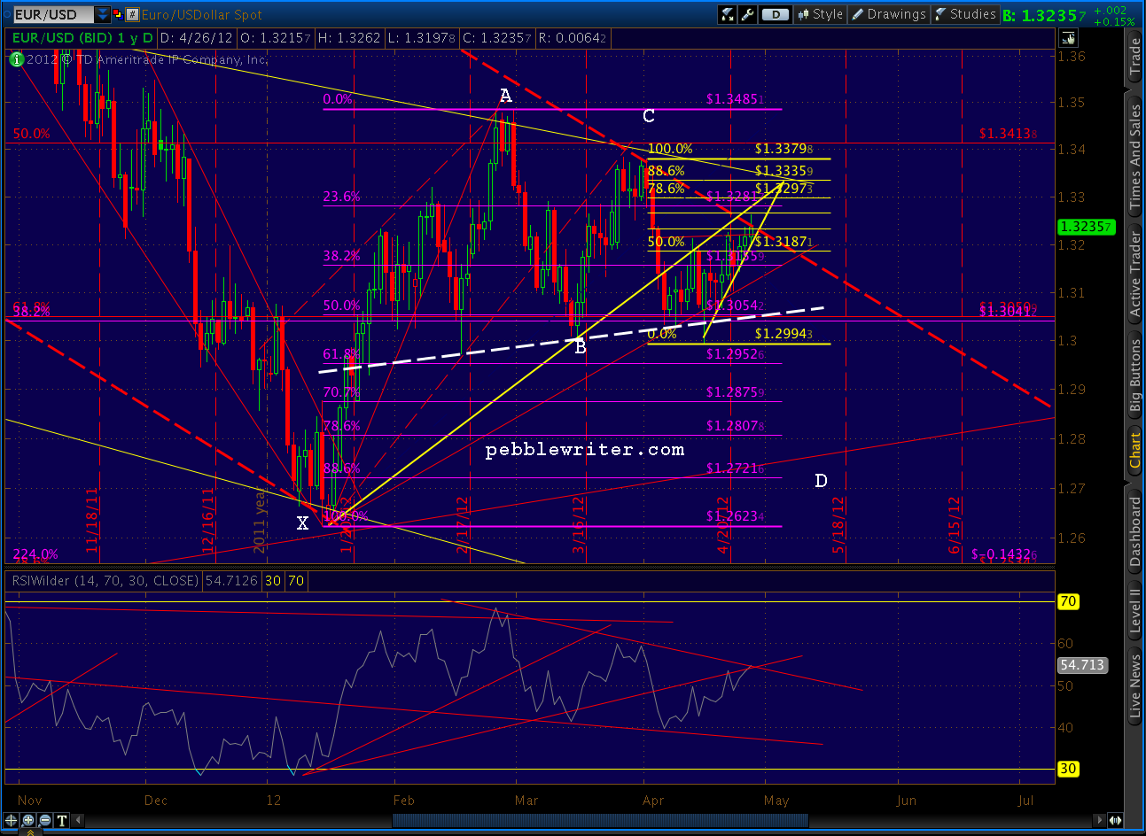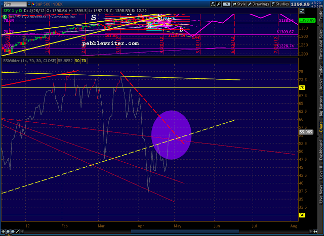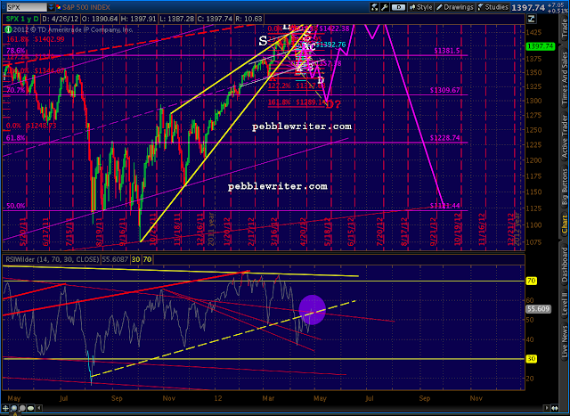 As we approach 1400, the market should at least pause. It’s the original H&S “idealized” shoulder line, the 1.272 of the small Crab pattern, and a nice round number. But, unless we reverse in the next hour and see that RSI dip back below the TL, I’m increasingly positive about a move to at least 1414-1415 to fulfill the Crab and Bat.
