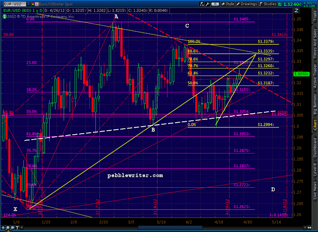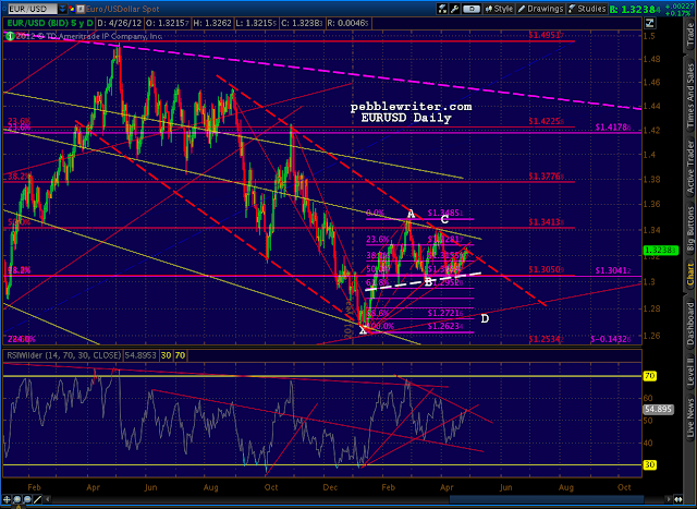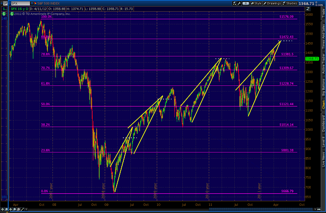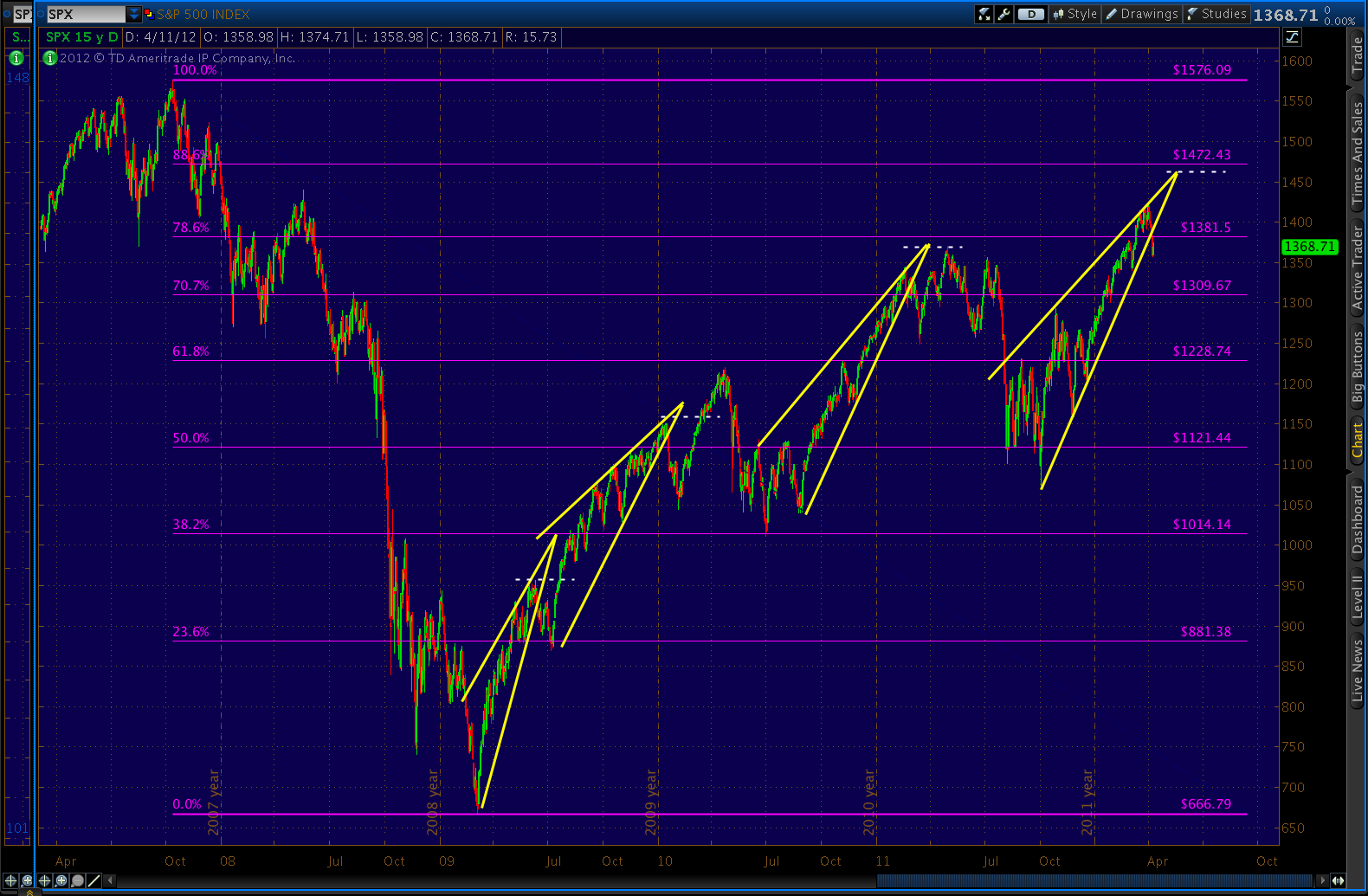 As we originally discussed, the thick, red dashed line is our target. It’s the center line of a channel that goes back to 1935. Really. The rising wedge apex intersects with it at around 1462, which is the 1.618 extension of the purple Crab pattern detialed below (Point X at 1422.38).