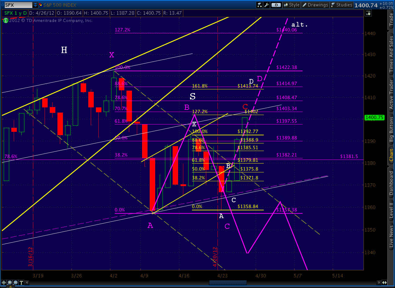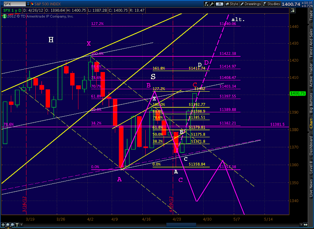 From a bearish perspective, one small Bat pattern that indicated more downside busted when we moved above 1392. The larger Butterfly (labeled in red) will need its Point C moved over to today’s high, but won’t bust until/unless we exceed 1422 (where C > A.)