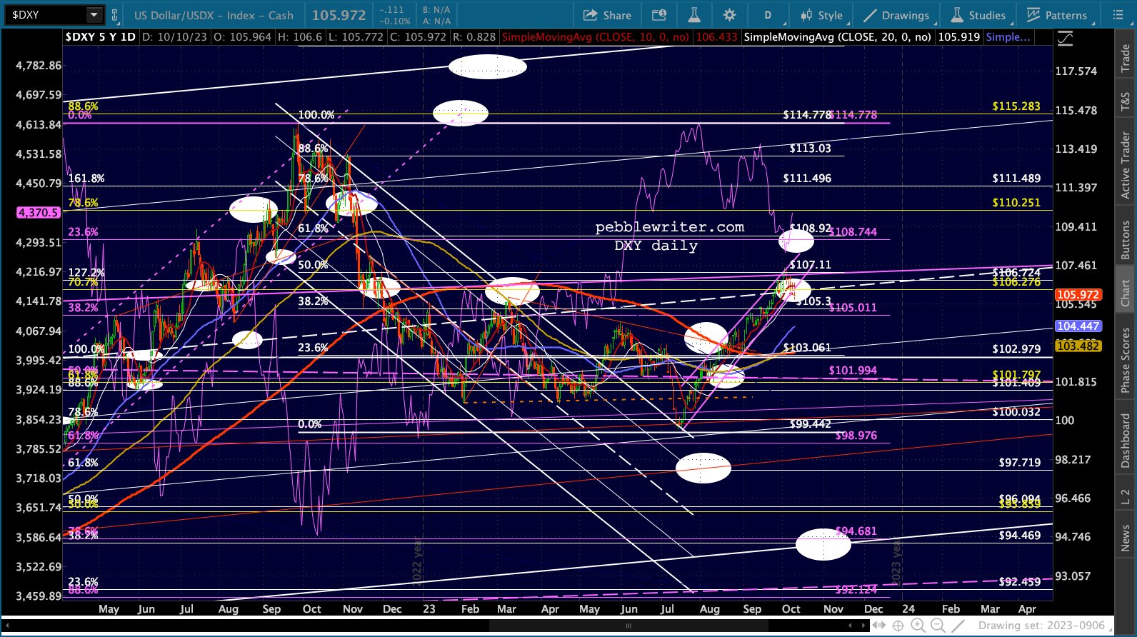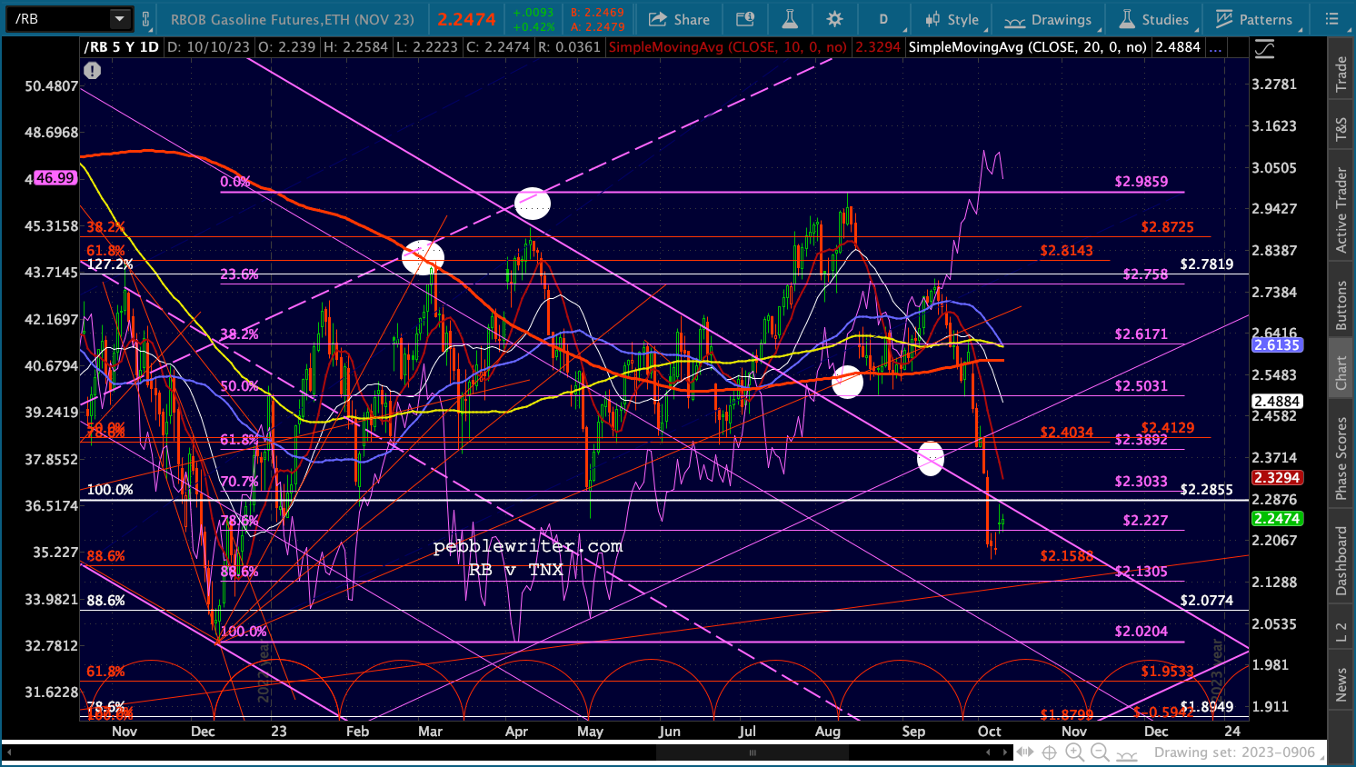 Note this is a key fanline from the Oct 2022 lows as well as the midline of the rising yellow and purple channels.