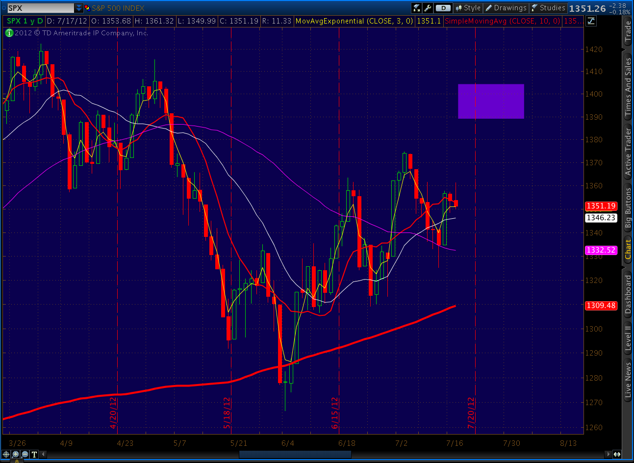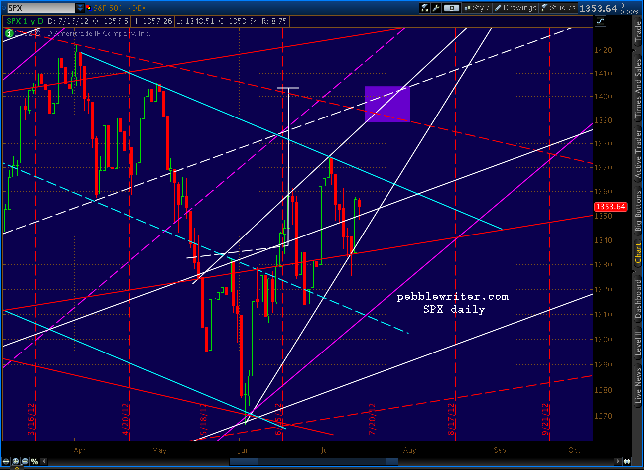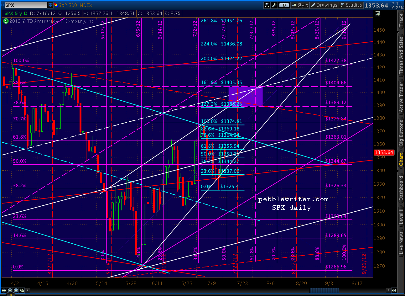In this case, the Fibonacci .618 time line is July 31. The .618 price line has already been met, so we look instead at the two most likely Fibonacci price retracements: the .786 at 1389 and the .886 at 1404. I’ve highlighted all three in the chart below (the bold purple dashed lines) and drawn a target area (rectangle) that encompasses them.