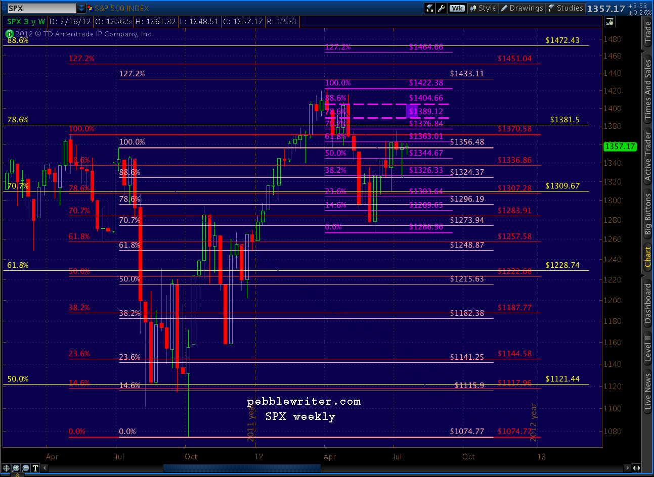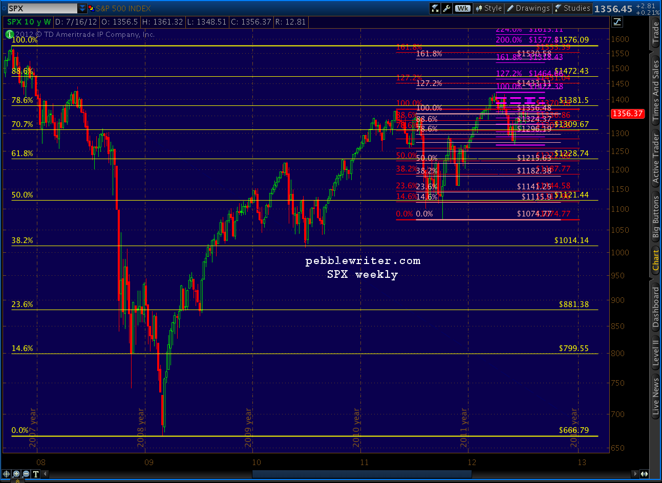 The yellow grid, which dates back to the October 2007 1576 high, featured a .618 Point B which can yield either a Gartley that completes at the .786 (1381.50, already exceeded) or the .886 (1472.43, up ahead.)