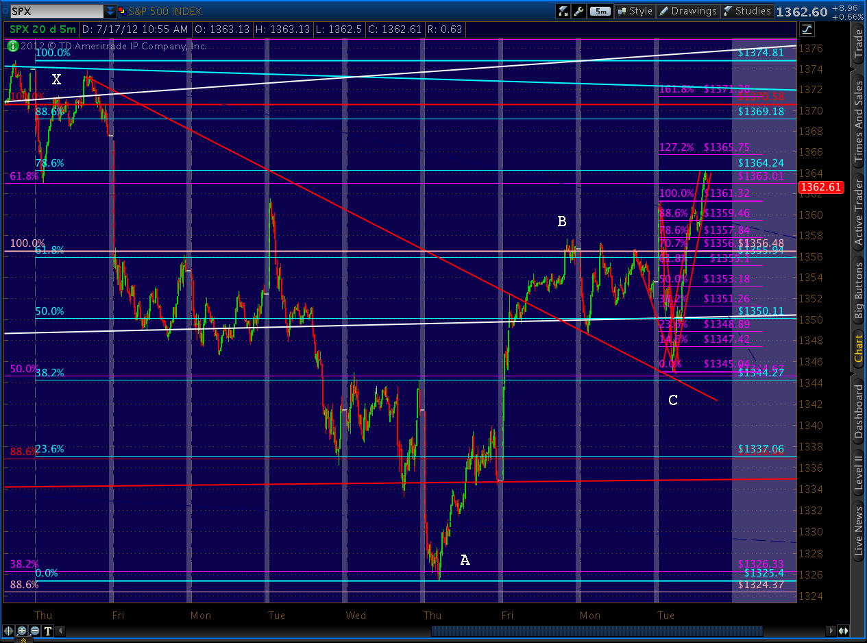 We’re getting very close to the Fib .786 line of 1364.24 mentioned earlier this morning. We will likely see at least a pause here, since this is a potential Gartley target set up by a .618 Point B at 1357 last Friday. As long as we stay in the little channel up, I’m long. Otherwise, I’ll likely make some intra-day trades – try to capture a few extra points.