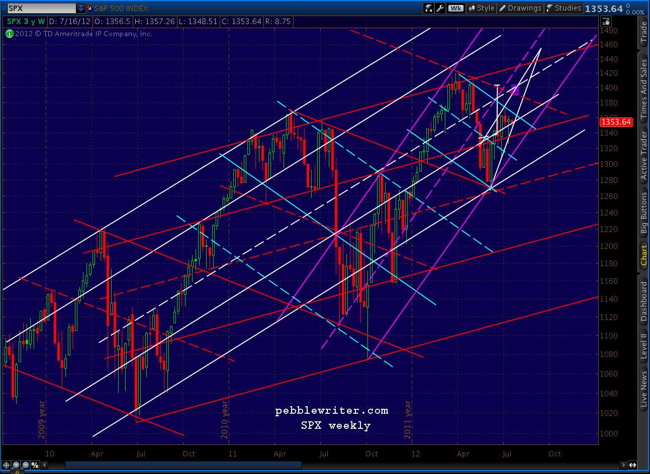 great work Pebble. do not fear to put your advice into writing, because no reasonable man could expect you to be right all the time. I agree with your 1400-ish target. It feels to me we are in the same spot technically as last summer before the big correction… trend following seems to be bullish, but I would not expect to see 1451 without any serious correction. No QE3 with markets this high I would say.
