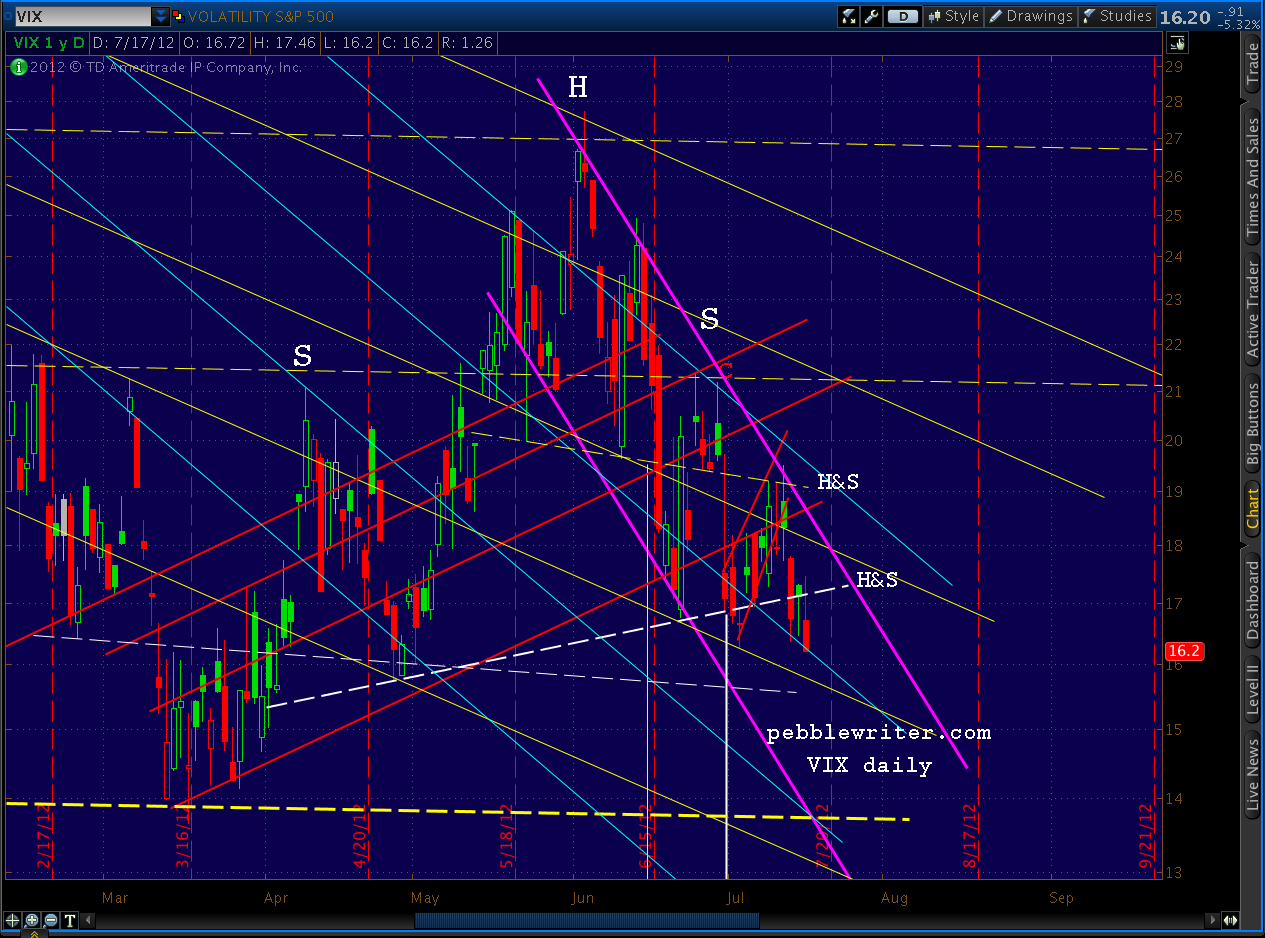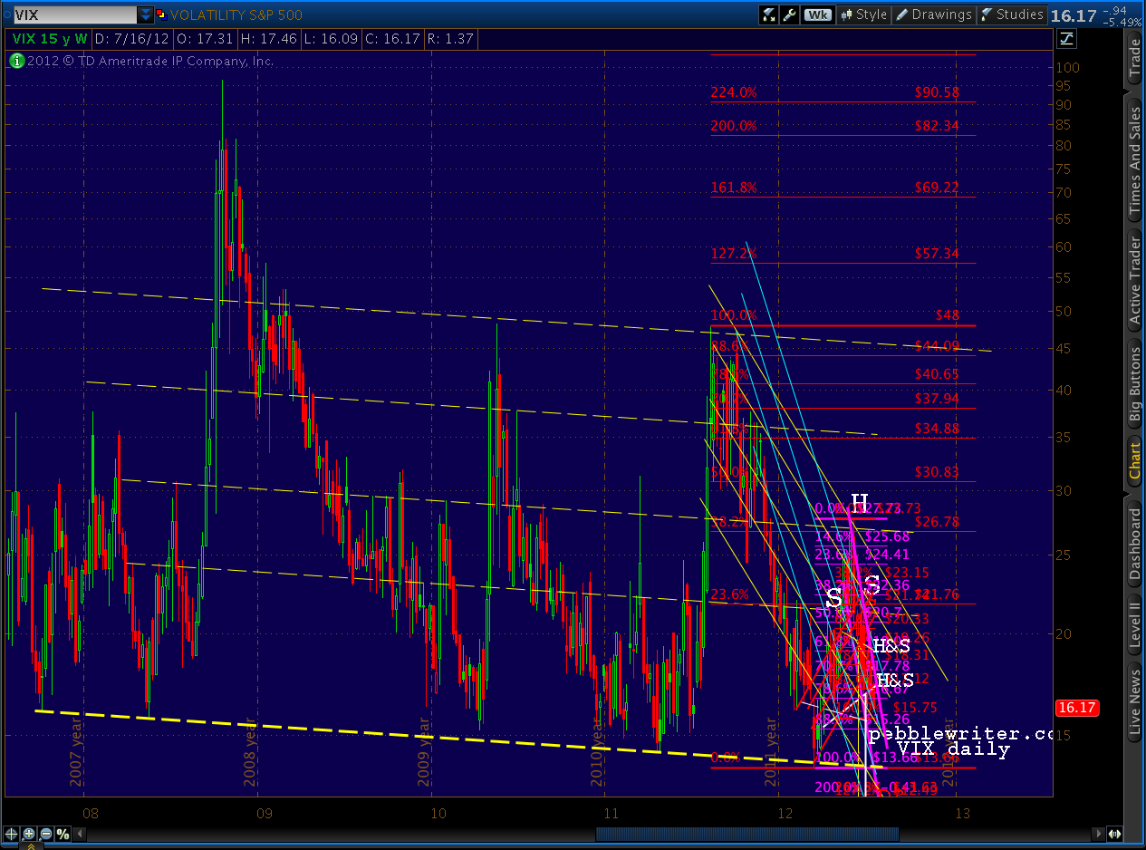 Remember, we have two completed H&S patterns now, both of which indicate much lower prices. The yellow pattern targets 11.46 and the the white pattern an improbable 5.50. VIX hasn’t been down to single digits since Feb 2007.