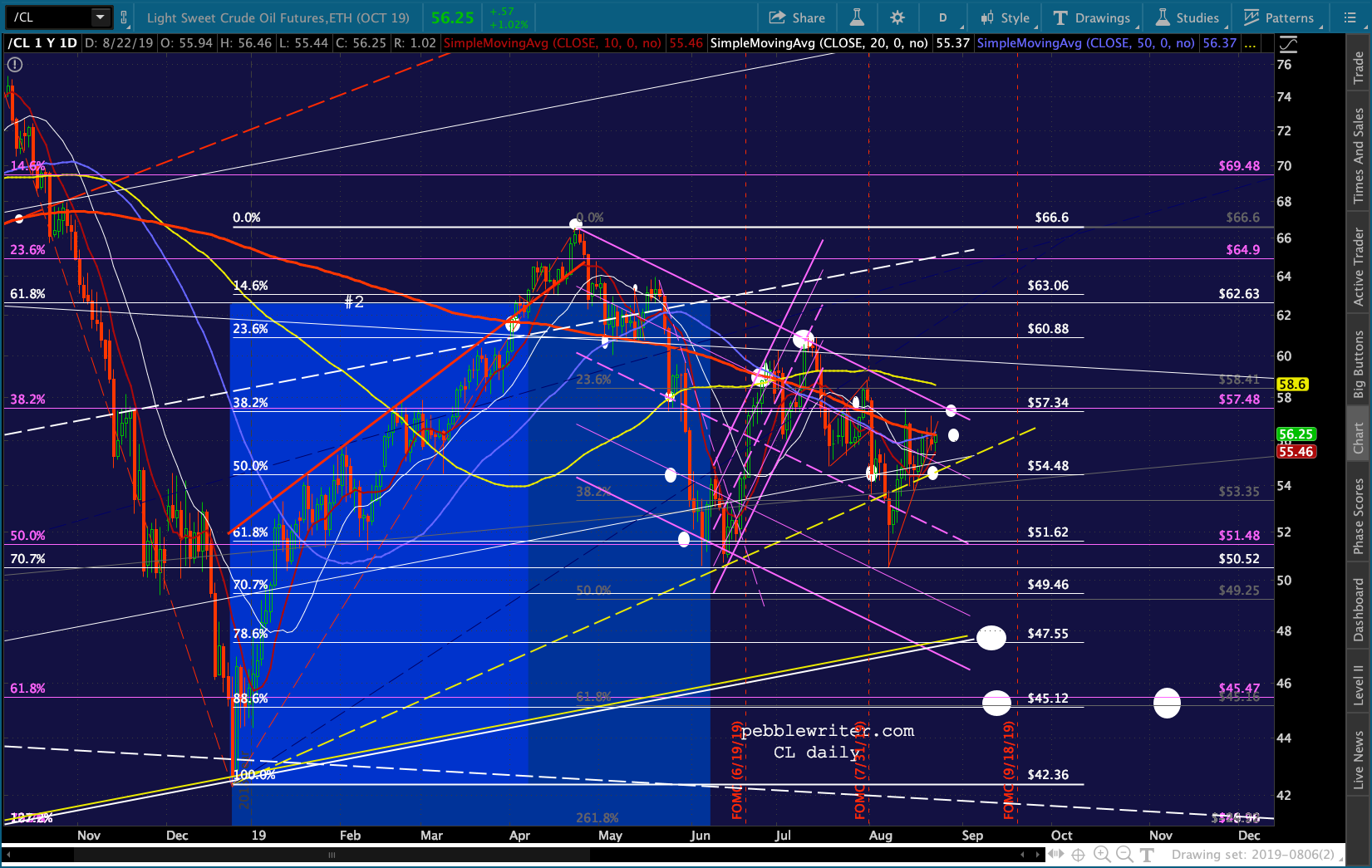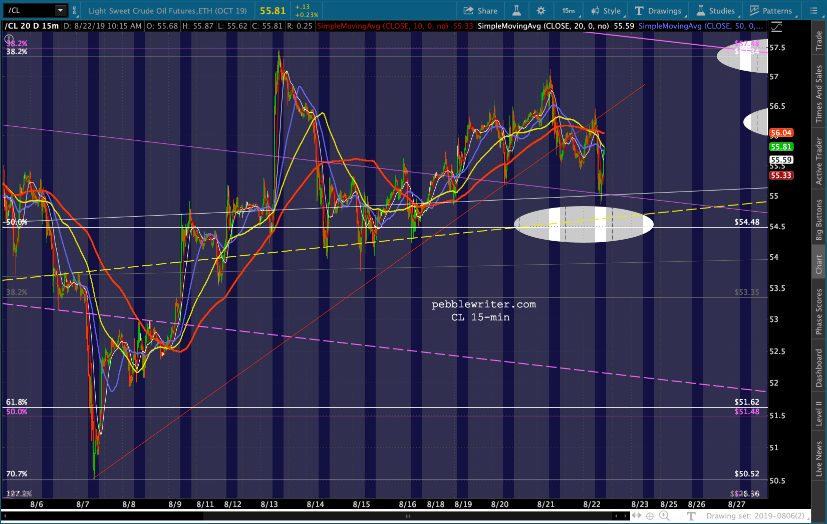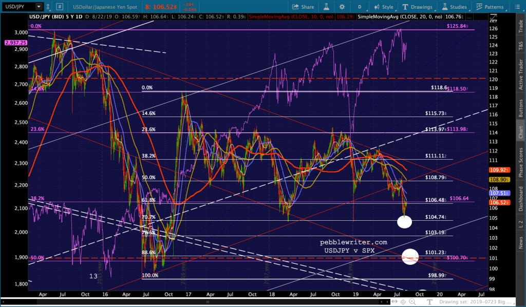 The purple TL just above was a potential neckline from June which, by not bouncing in early August, ES ignored. Nevertheless it represents a TL of overhead resistance that has contained the market on 4 previous occasions. So, we’ll keep an eye on it even as the red TL has been broken.