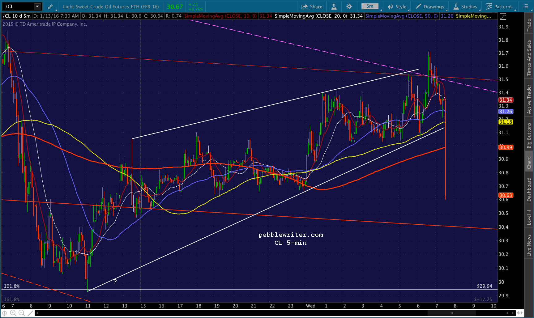 They got a little out of sync. But ES just tagged the red TL at 1918 exactly, while SPX reached the SMA5 200. It could obviously go lower, but I think I’ll take profits here at 1926.32 and wait and see. It should be safe to go long here, but USDJPY isn’t bouncing at all, and we’ve got important Fibs just below. Besides, the falling SMA5’s will catch down with SPX at 1930ish, which IMO isn’t enough upside to justify a trade.