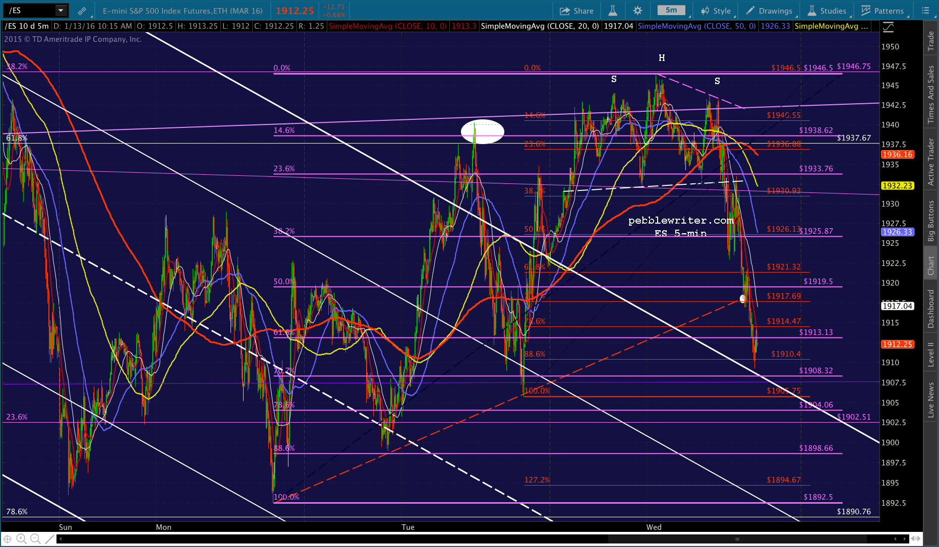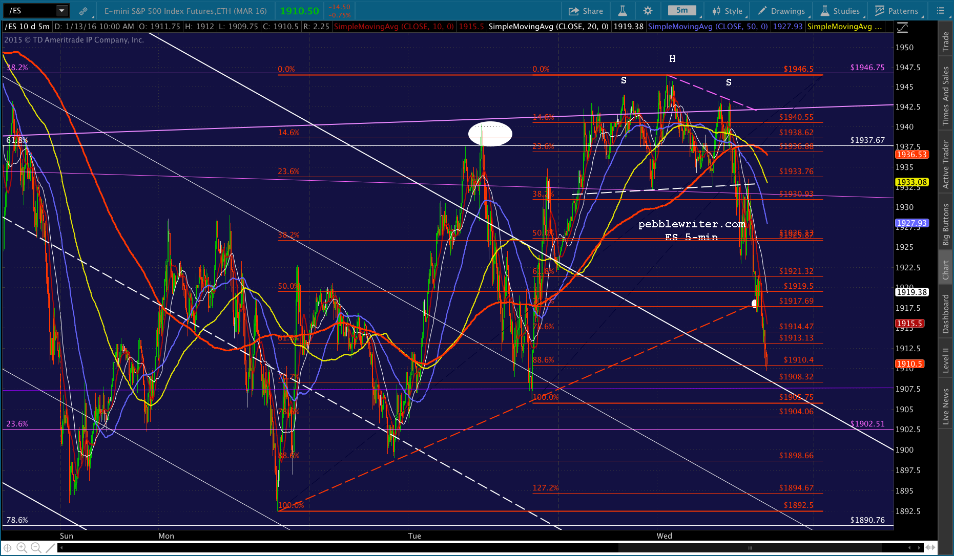 Next downside target – the .886 at 1906.71. It’s also the .886 of the purple ES chart. Should get a bounce here – perhaps up to SMA5 10 now at 1914. Worth a shot at a long position here at 1906.69 for those 8+ points.