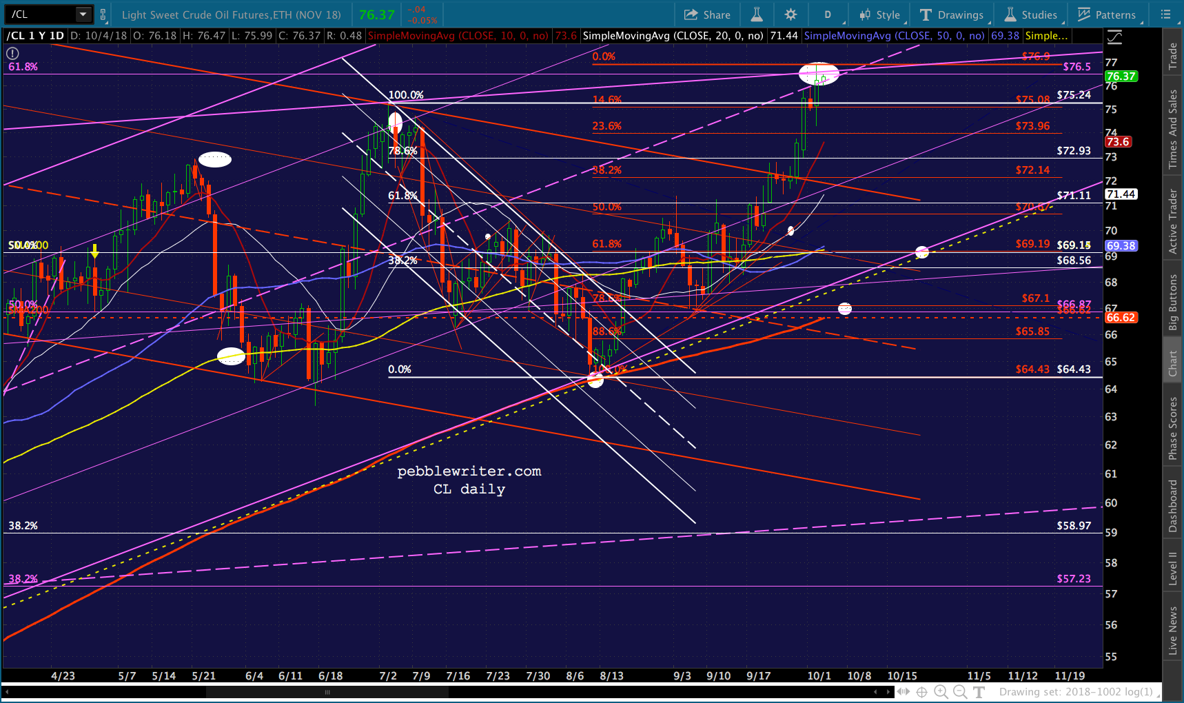 And, oil and gas are very long overdue for a tumble — that inflation problem, again, not to mention a slew of chart patterns that spell a reversal. Note that CL has reached our 76.50 target from January.