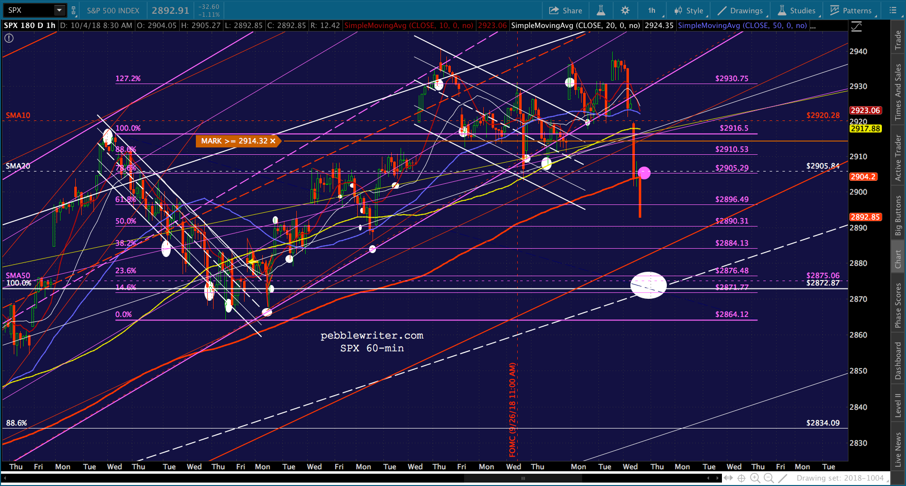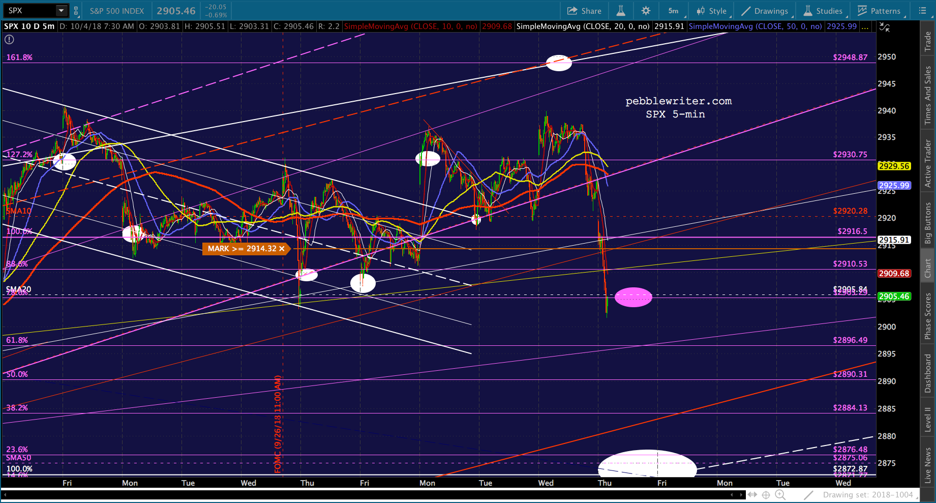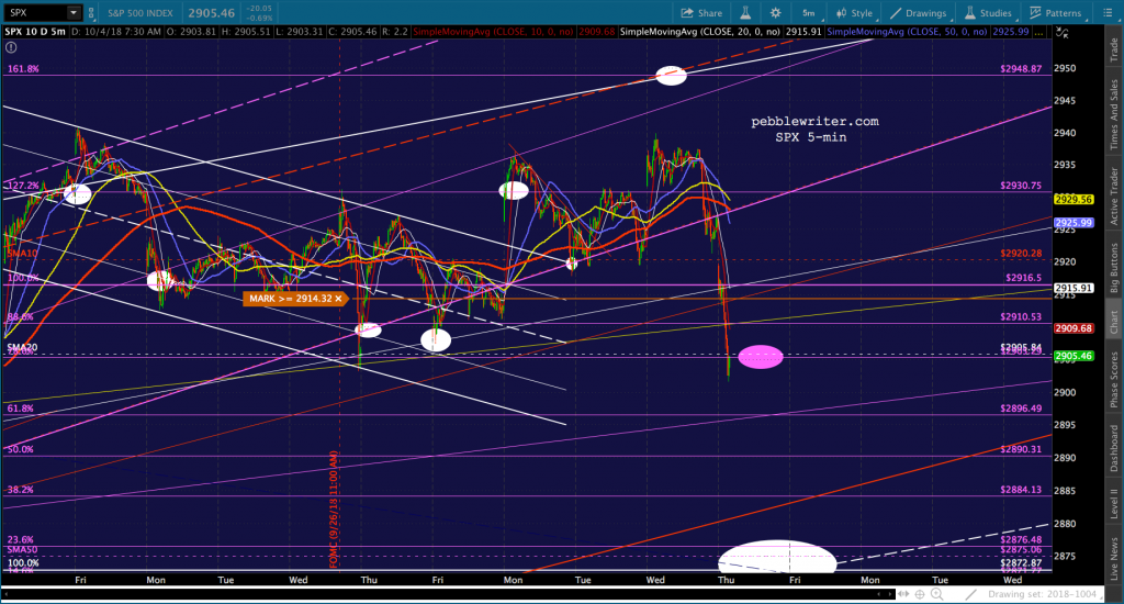 SPX just reached, and slightly overshot, its SMA20. If it doesn’t hold, the .618 at 2896.49 and the SMA50/ white channel midline at 2875 are the next important levels of support.