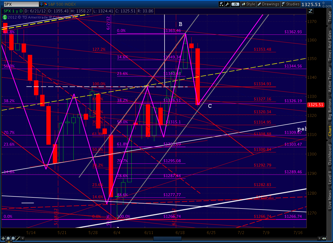 We’ve retraced .382 of the A-B rise from 1266 to 1363, a perfectly acceptable Point C. We’ve also very nearly backtested the upper bound of the channel that brought us down from 1415.