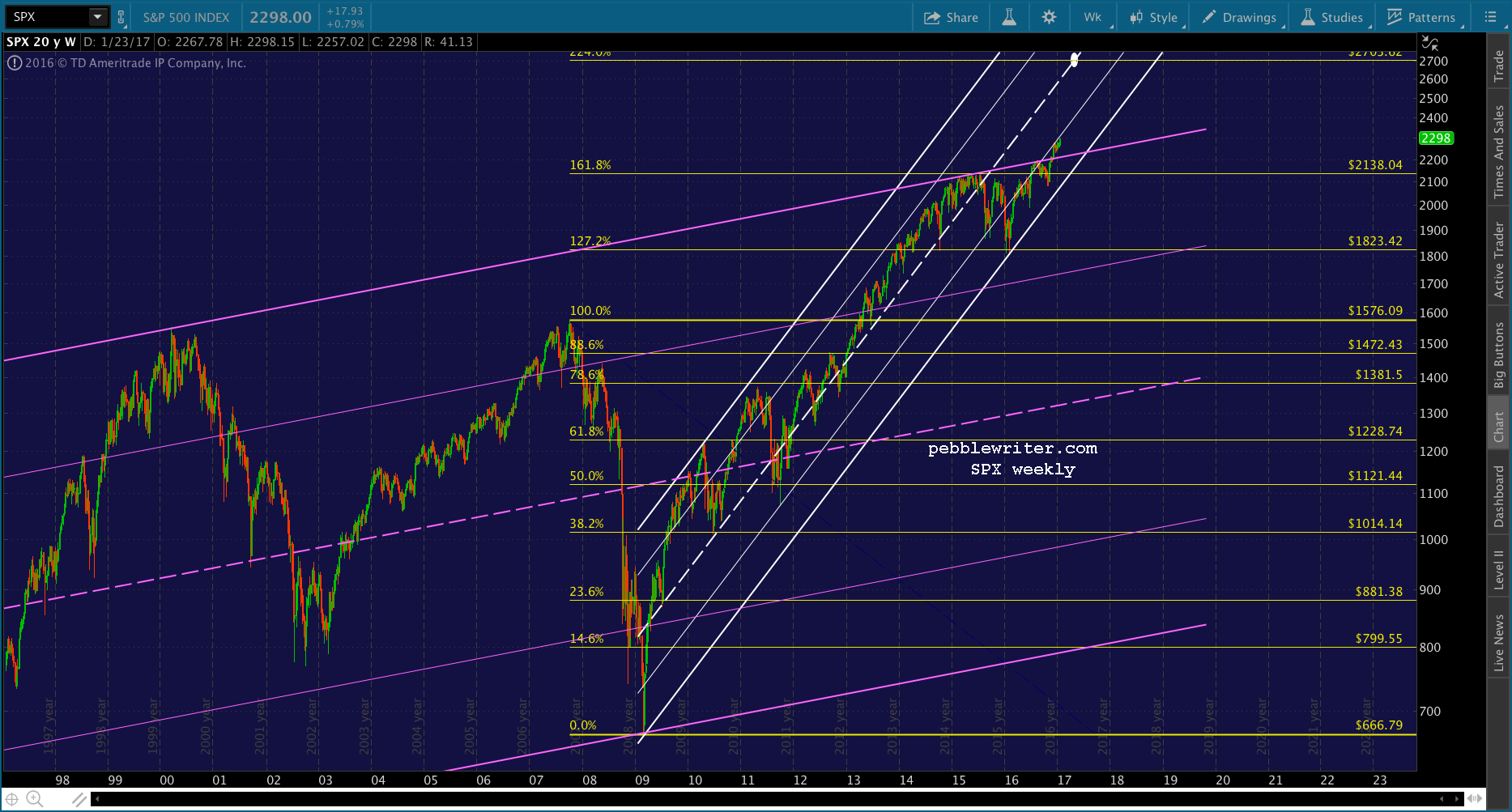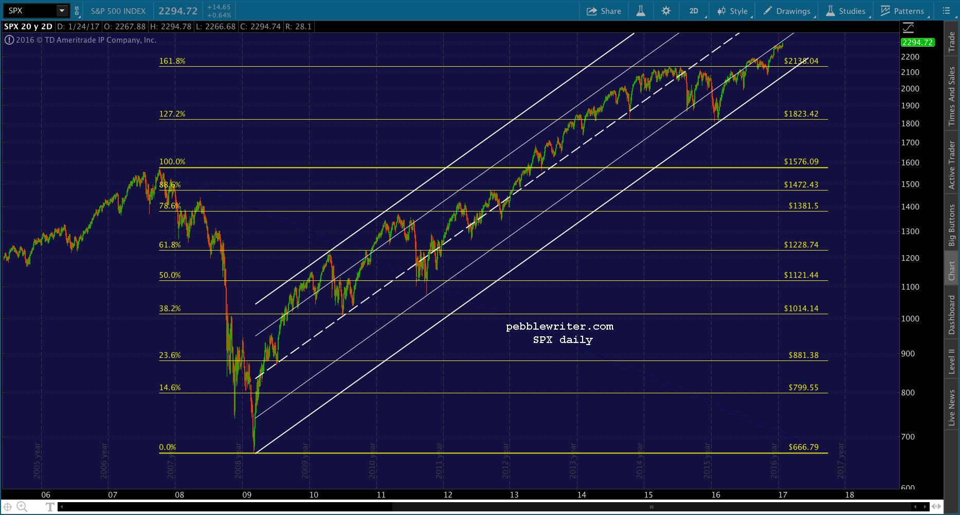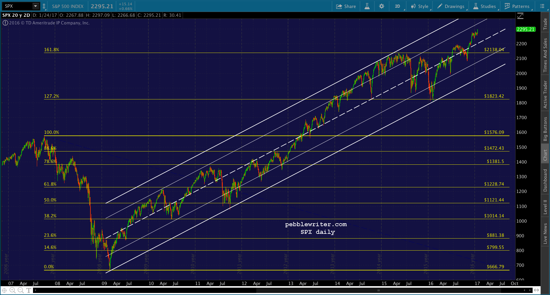 The hitch is that a smaller scale 1.618 was reached today — the red 1.618 at 2299.31. I think it’s likely that SPX will pause and backfill here.