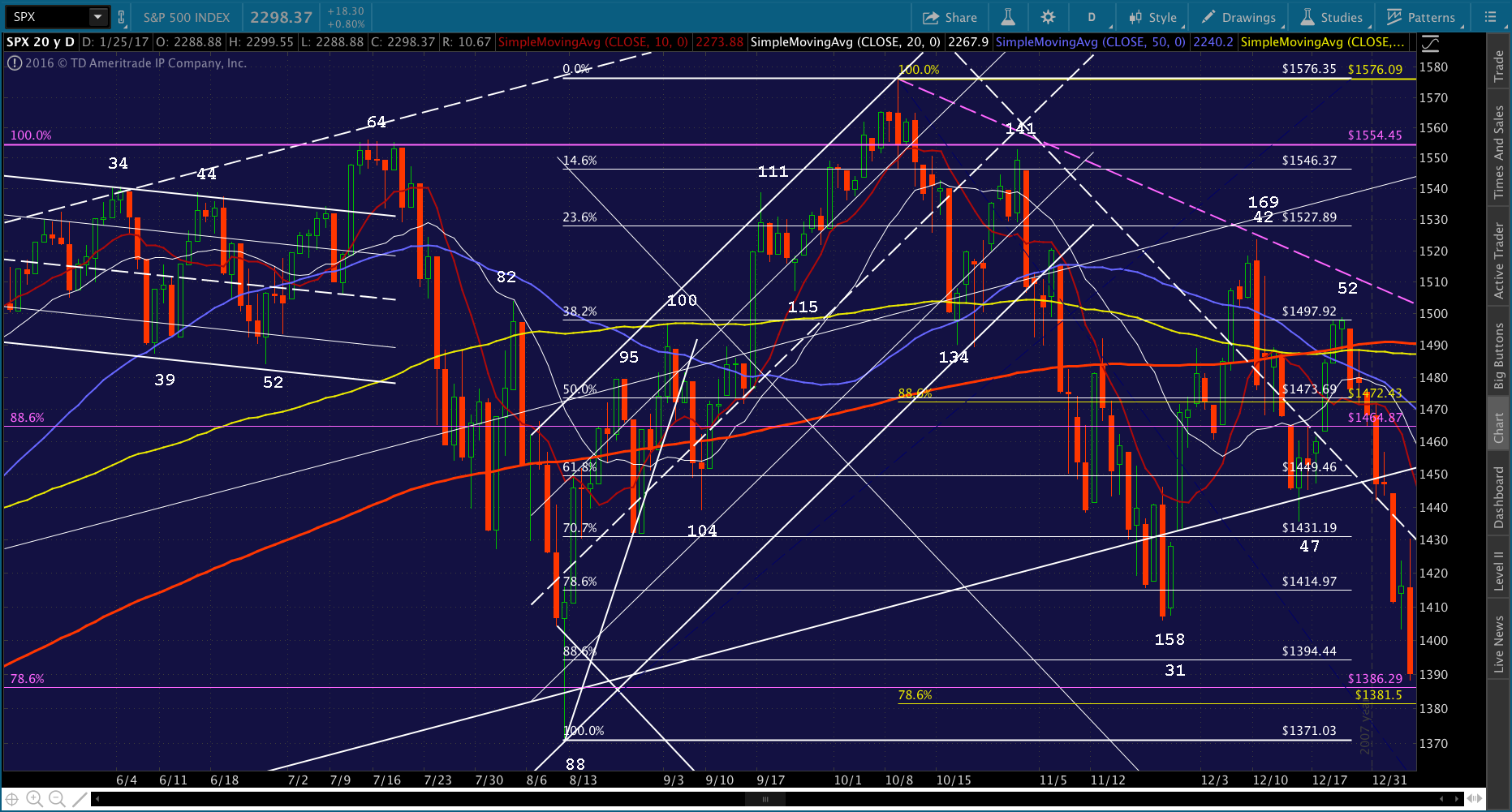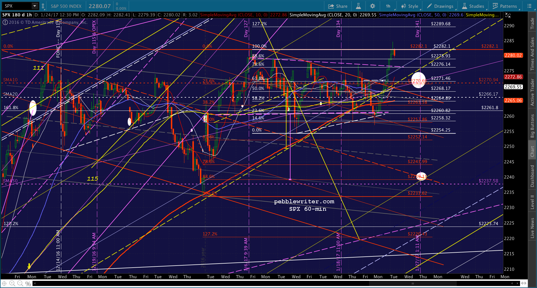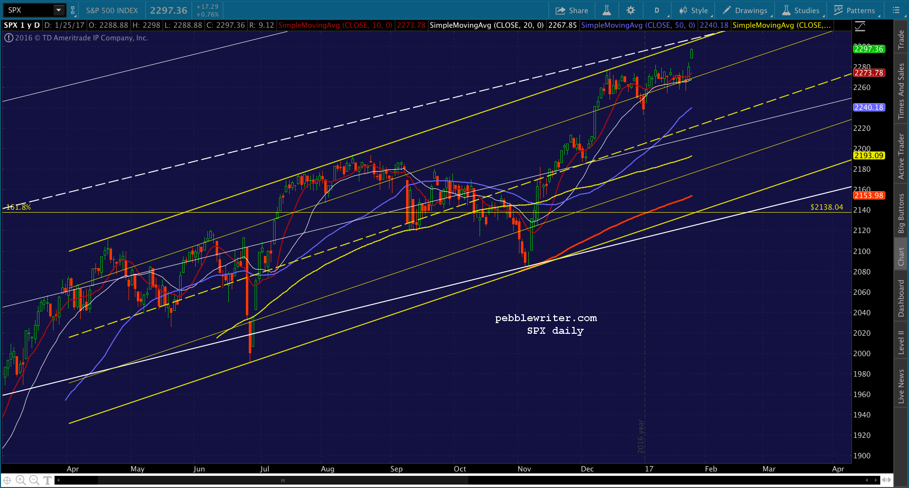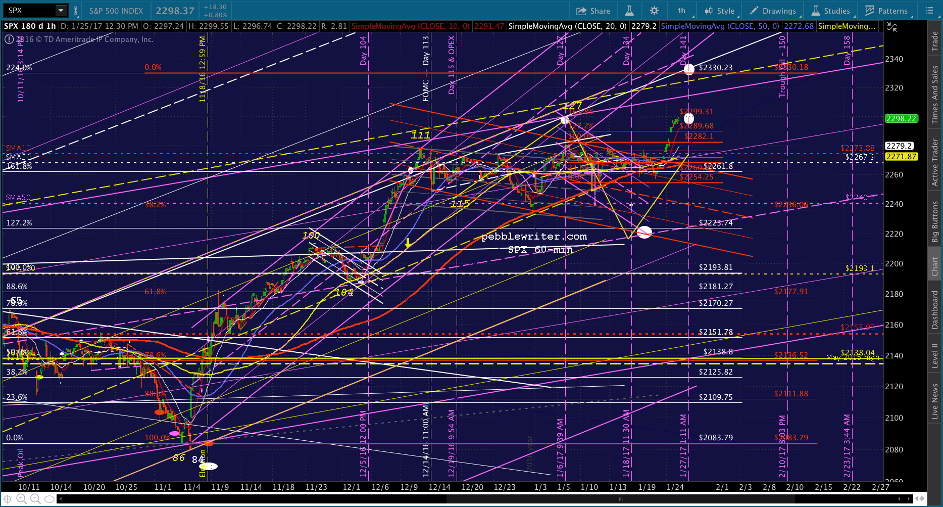 The hitch is that a smaller scale 1.618 was reached today — the red 1.618 at 2299.31. I think it’s likely that SPX will pause and backfill here.