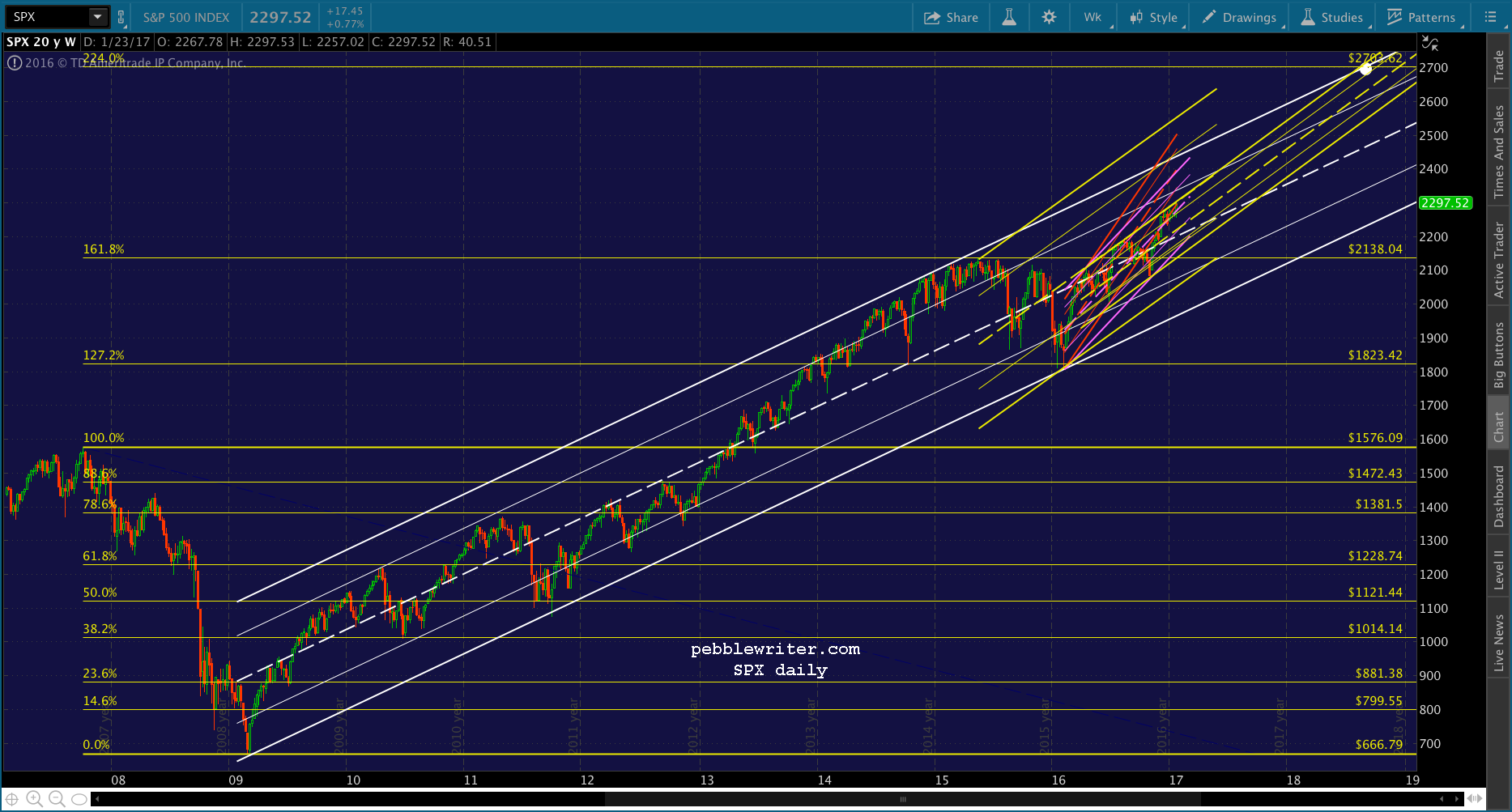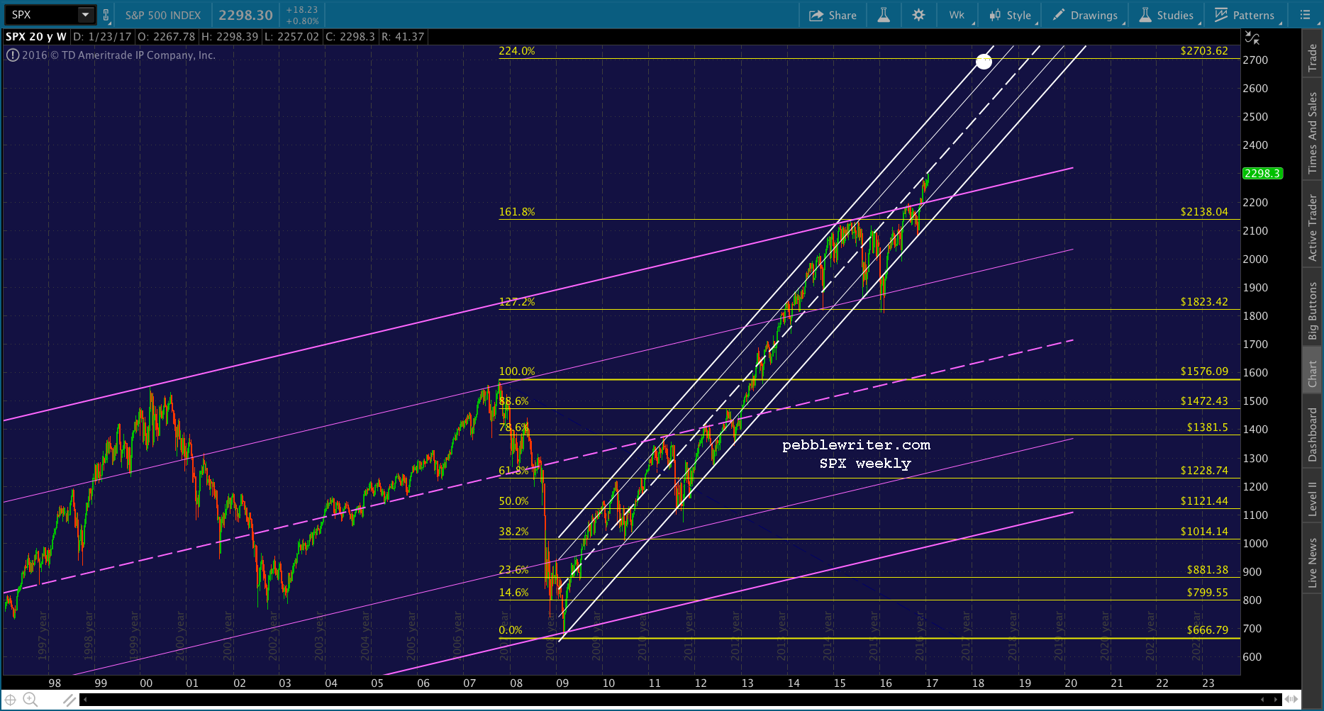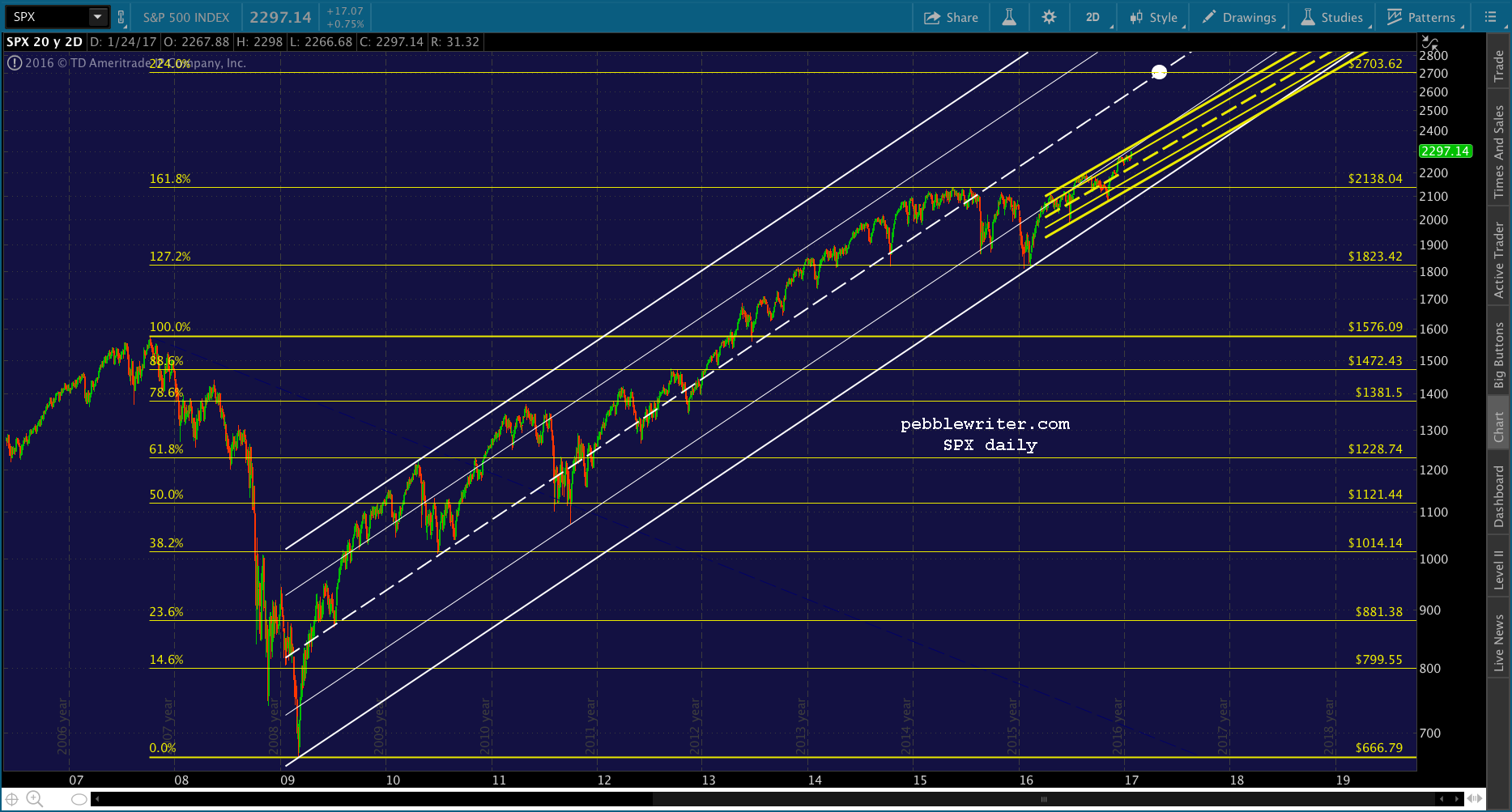 If we go by the arithmetic chart, the rising white channel doesn’t intersect 2703 until Sep 2018 or so. 18% over the next 20 months isn’t too bad, provided it can make it. The rising yellow channel seems to confirm the target.