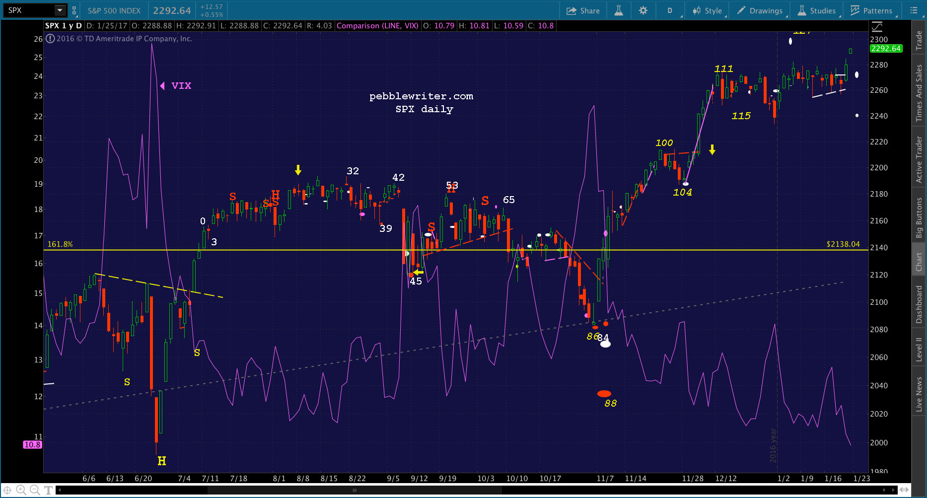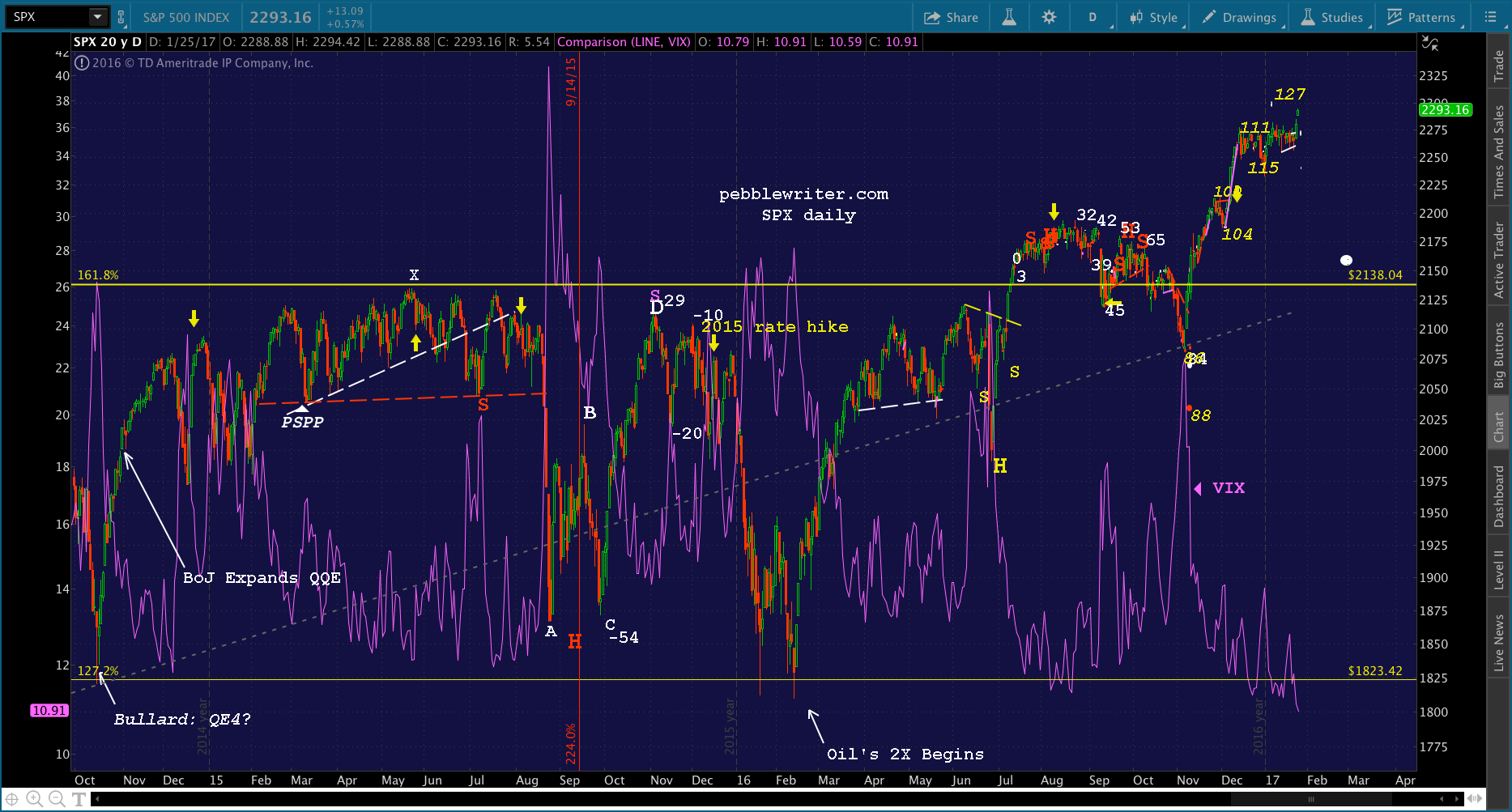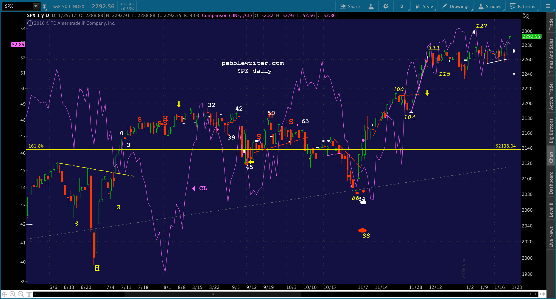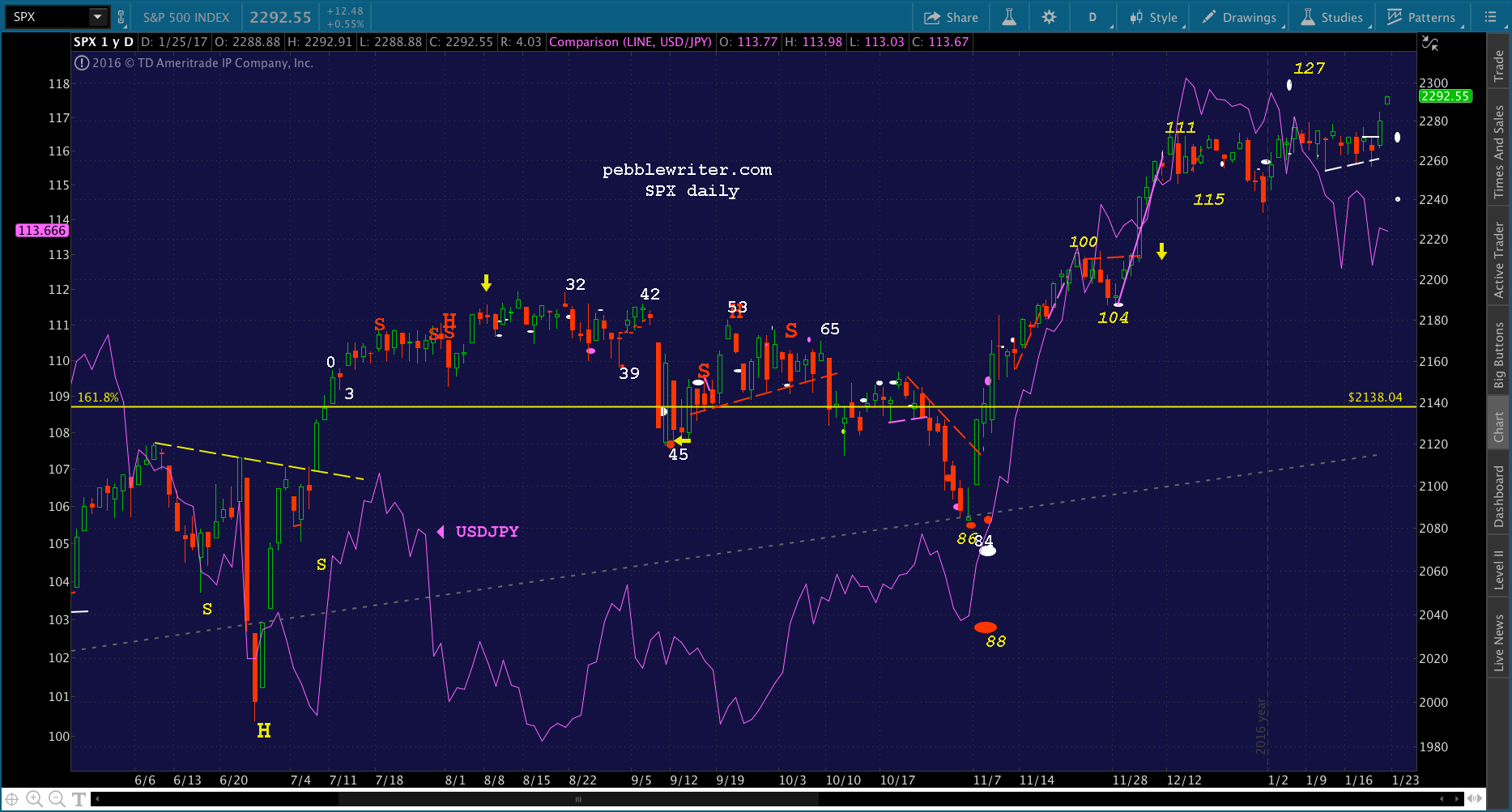 CL and USDJPY both played important roles, with well-timed pops in times in trouble. This was most evident in October and November when SPX broke down below 2138 leading up to the election.