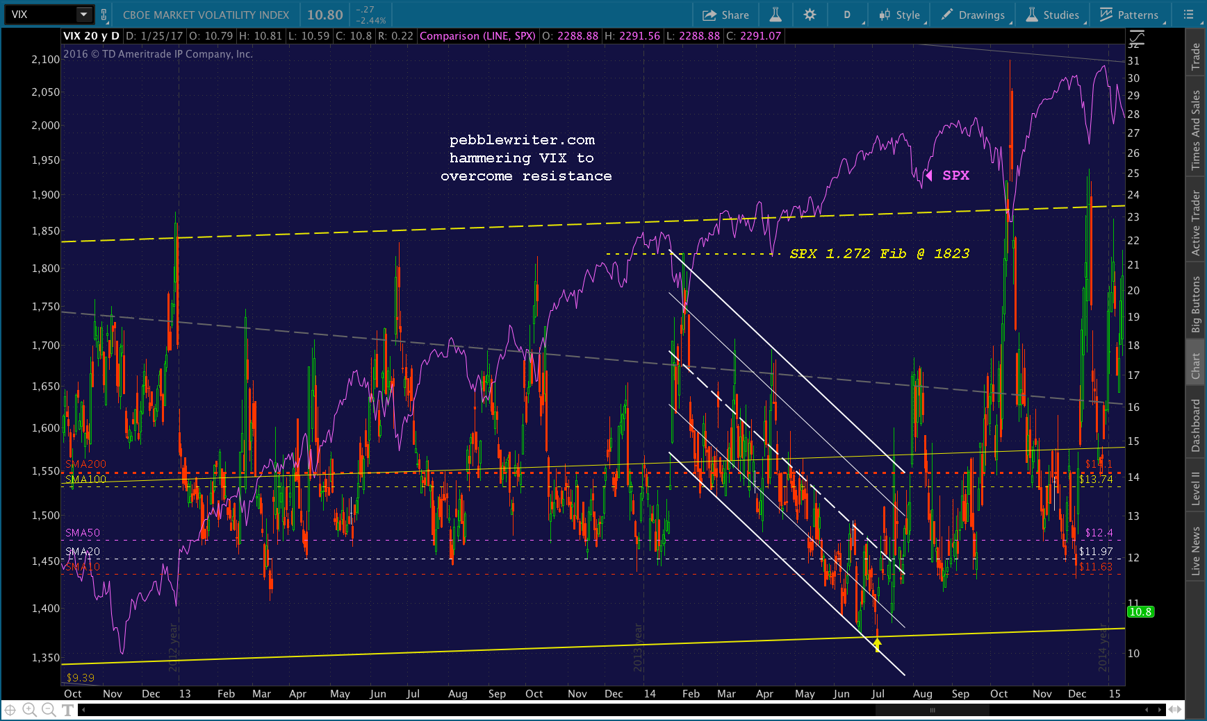 At 10.59, VIX hasn’t been lower since Jul 3 2014 when it reached 10.28 in the culmination of a similar move to get SPX up past critical resistance — the 1.272 extension (@ 1823) of the 2007-2009 crash. SPX should have reversed at 1823 at year-end 2013, but didn’t — partly because VIX was smashed from 16.75 to 11.69 (30%) over the low-volume Christmas holidays.