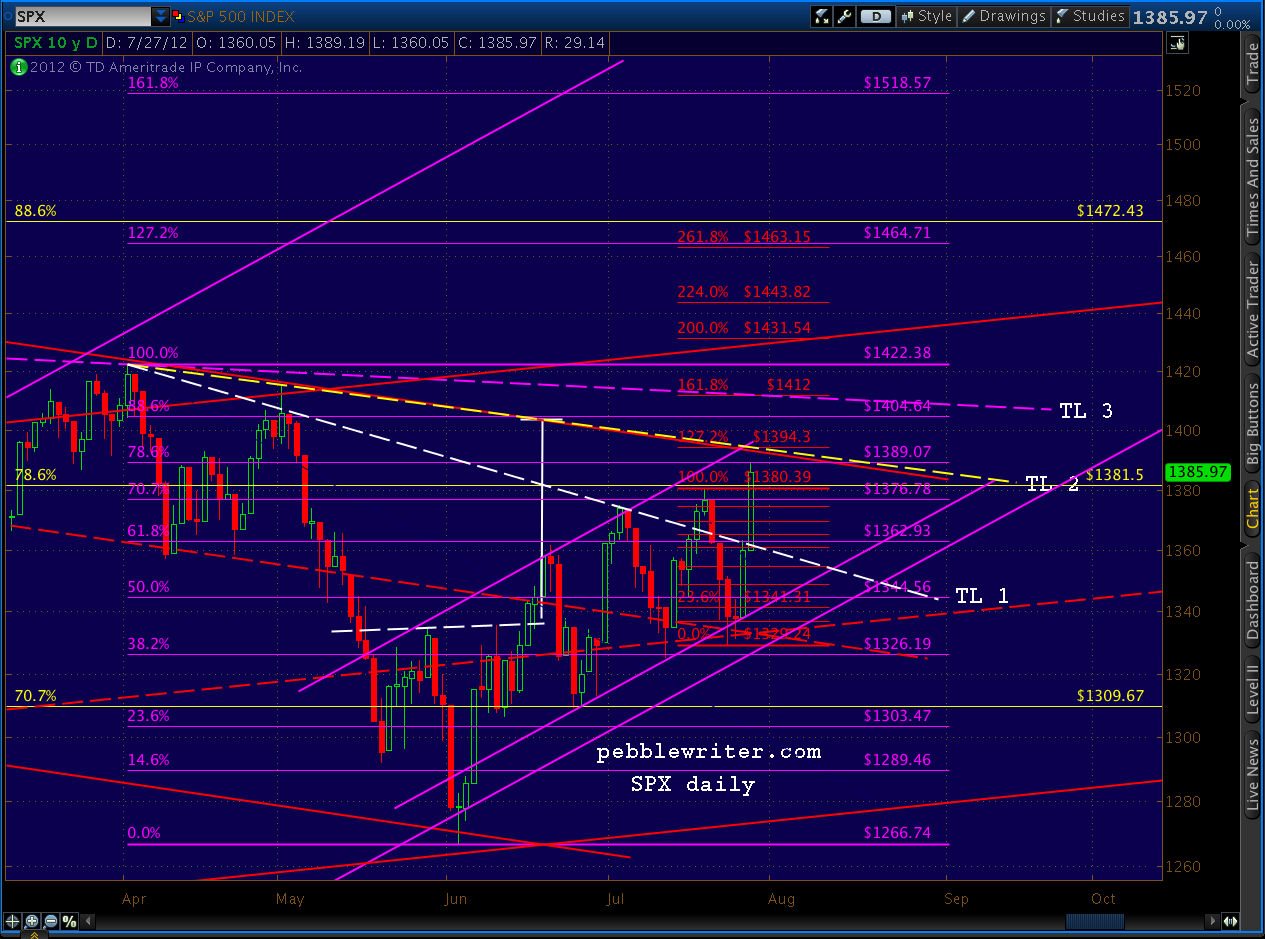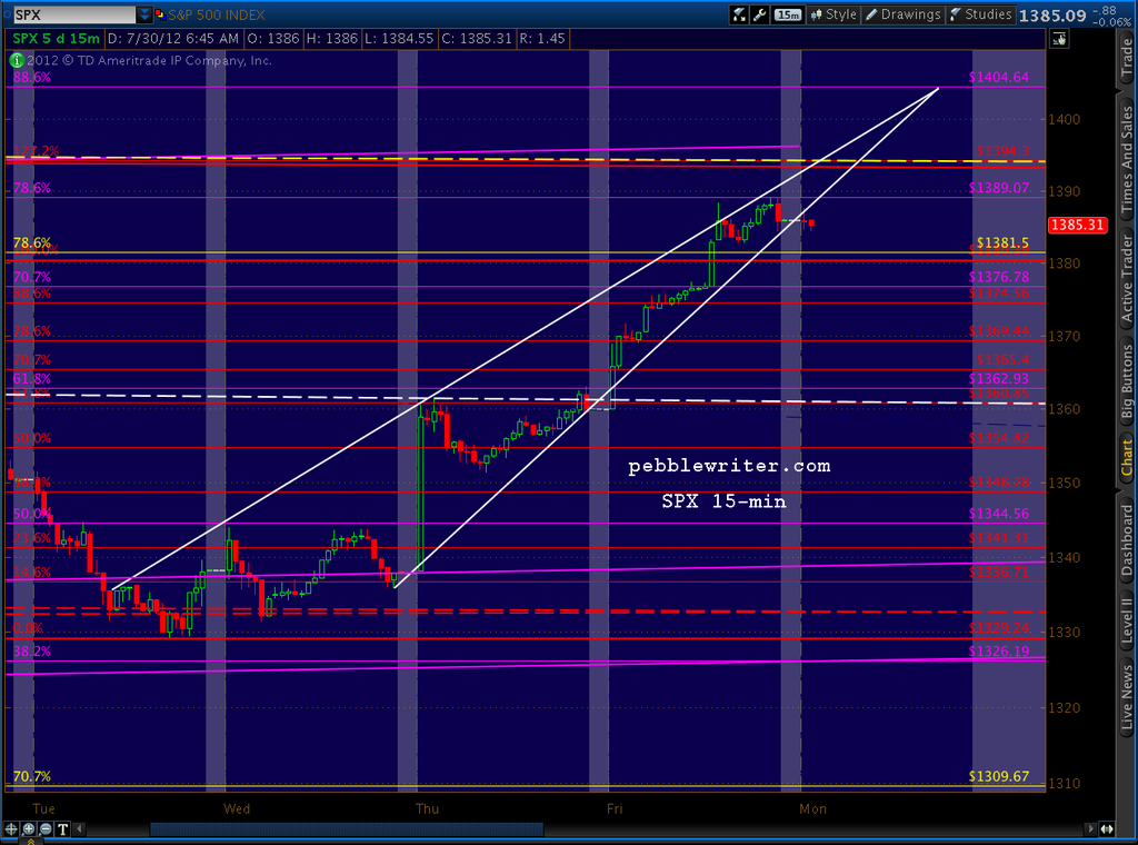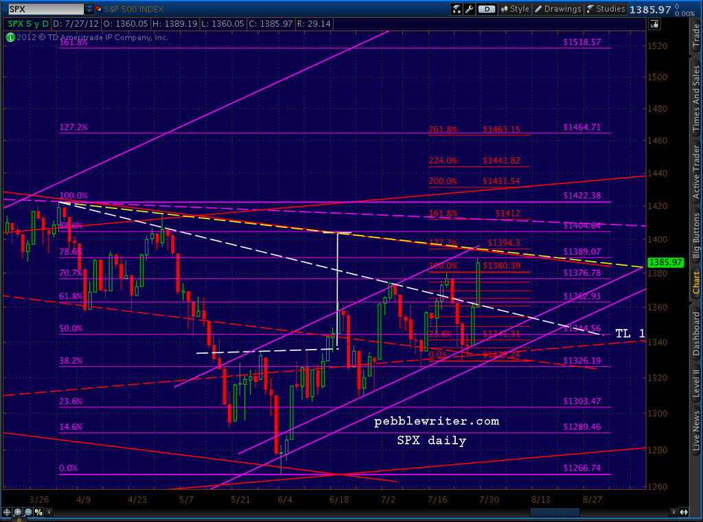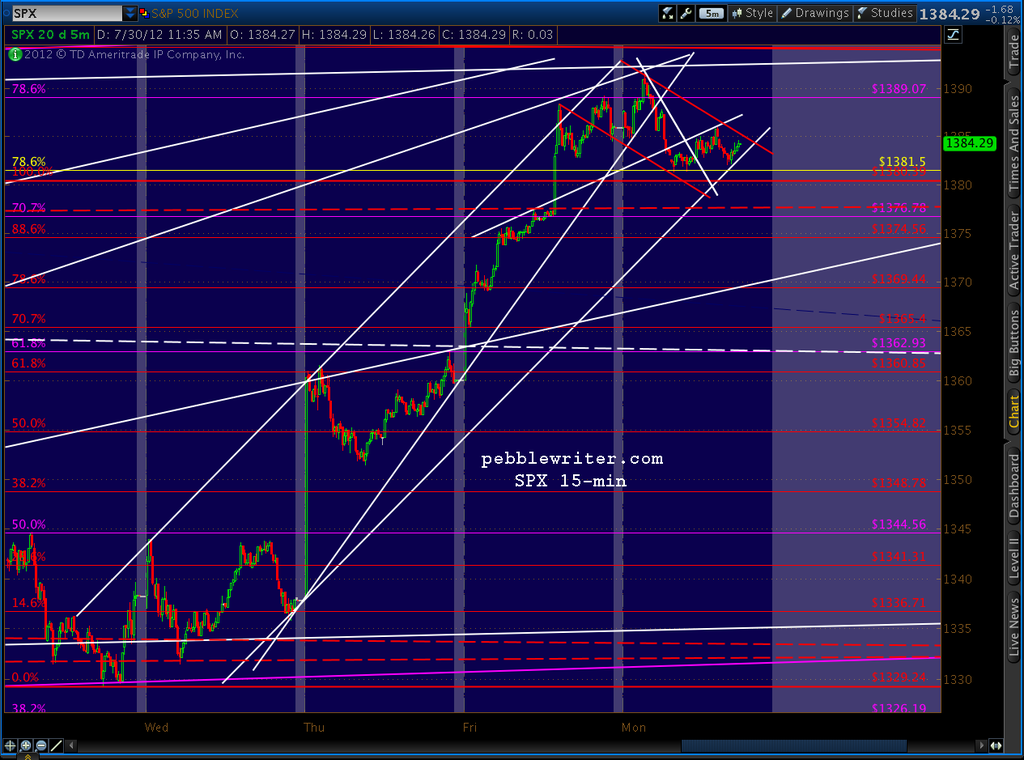 NOTE: the first paragraph of the post made at 9:35 EDT this morning was inadvertently overwritten. In it, I mentioned I was taking a small short position at 1387, based on the rising wedge formation (shown above) and the fact that we had reached the .786/1389 target detailed weeks ago. It is a small position because we’re at an obvious fork in the road that could lead to large gains or declines depending primarily on what the Feb announces in the next two days. Expectations are very high, particularly after multiple promises from across the pond to do whatever it takes to protect the EZ.