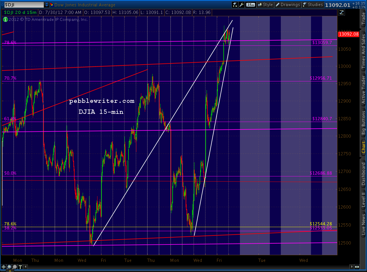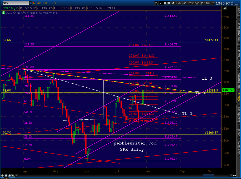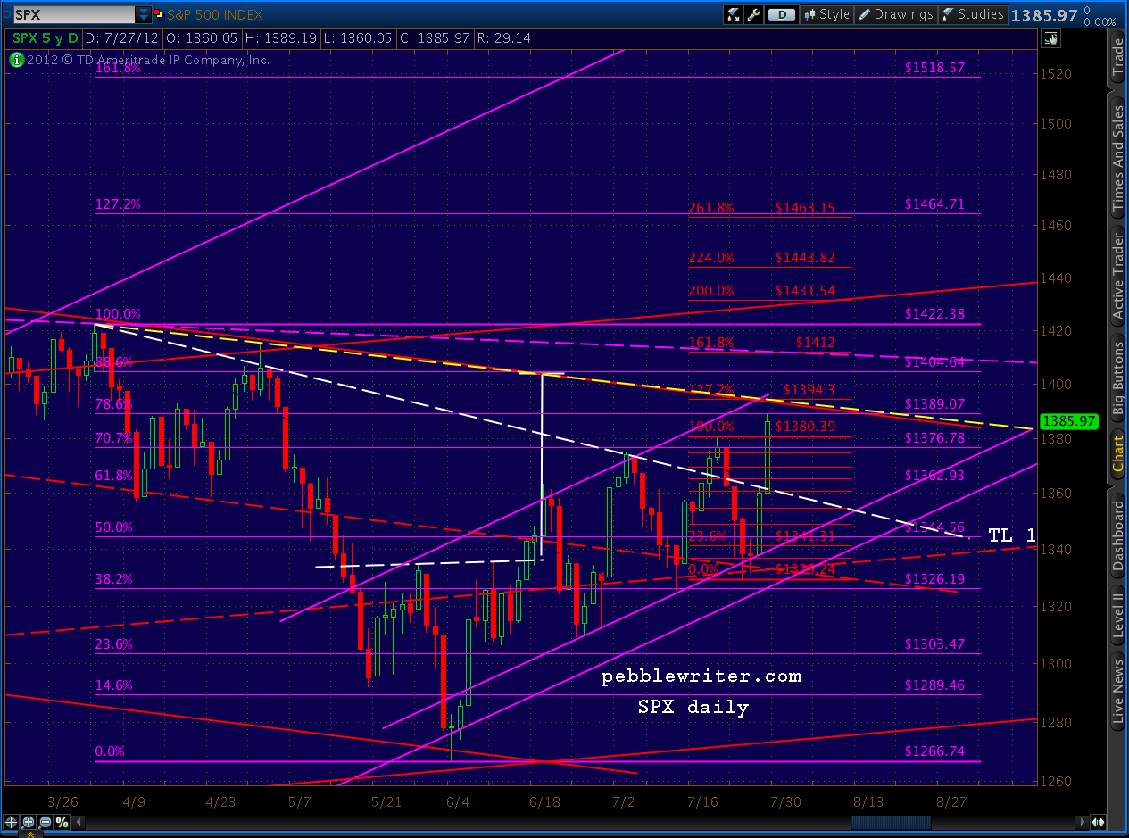 NOTE: the first paragraph of the post made at 9:35 EDT this morning was inadvertently overwritten. In it, I mentioned I was taking a small short position at 1387, based on the rising wedge formation (shown above) and the fact that we had reached the .786/1389 target detailed weeks ago. It is a small position because we’re at an obvious fork in the road that could lead to large gains or declines depending primarily on what the Feb announces in the next two days. Expectations are very high, particularly after multiple promises from across the pond to do whatever it takes to protect the EZ.