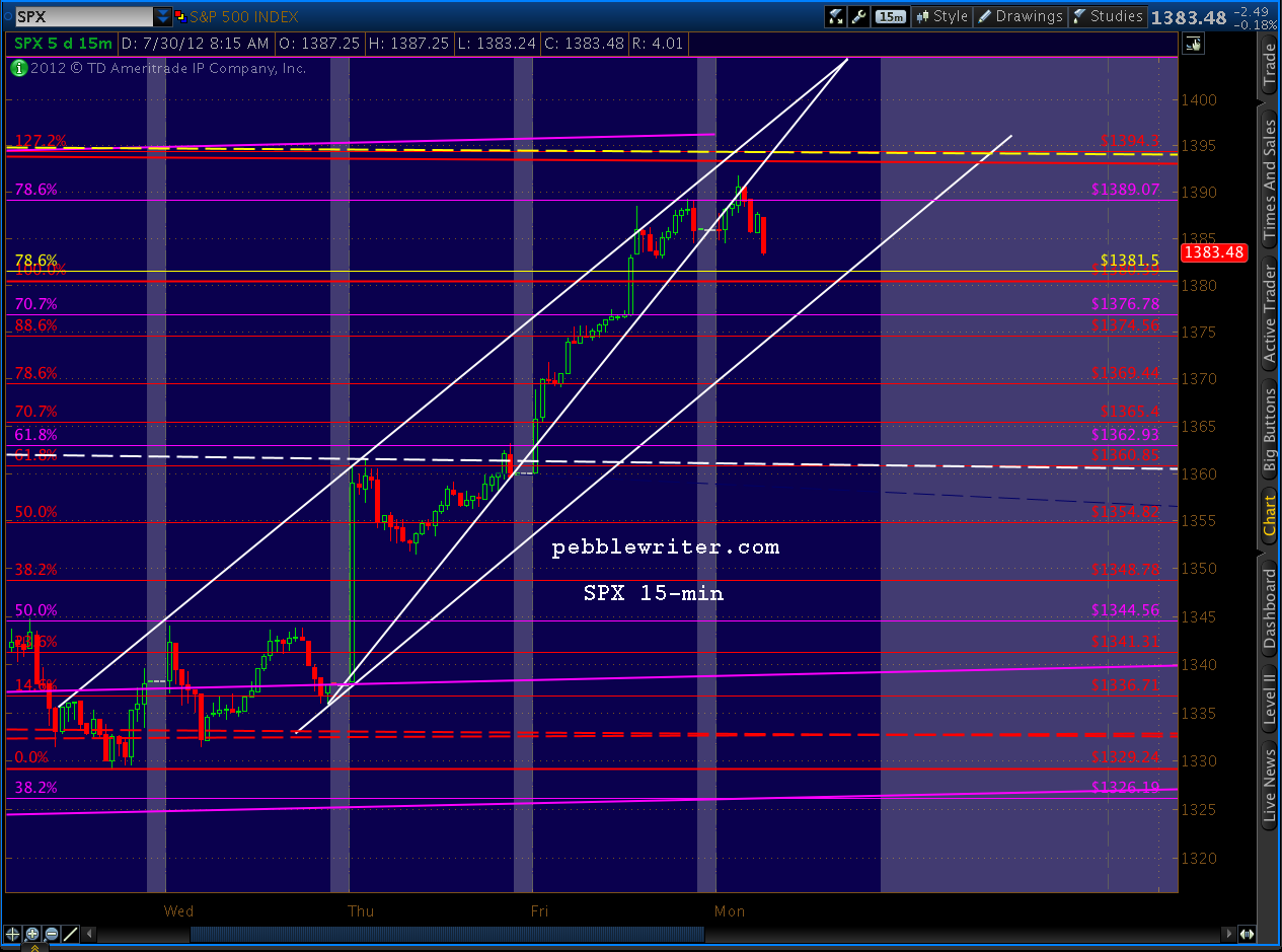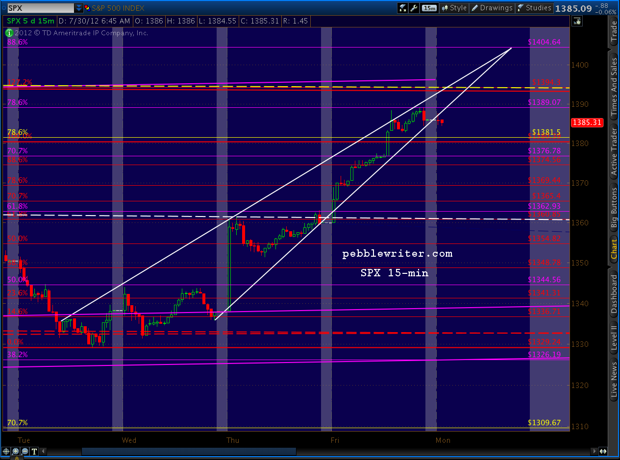 That’s strange. I must have somehow wiped the first paragraph of my initial post this morning. Probably saved over it. It read something to the effect of “taking a small short position at 1387.” That’s why I showed the chart of the rising wedge and wrote “If we exceed Friday’s 1389 in the short run, it’ll likely be an