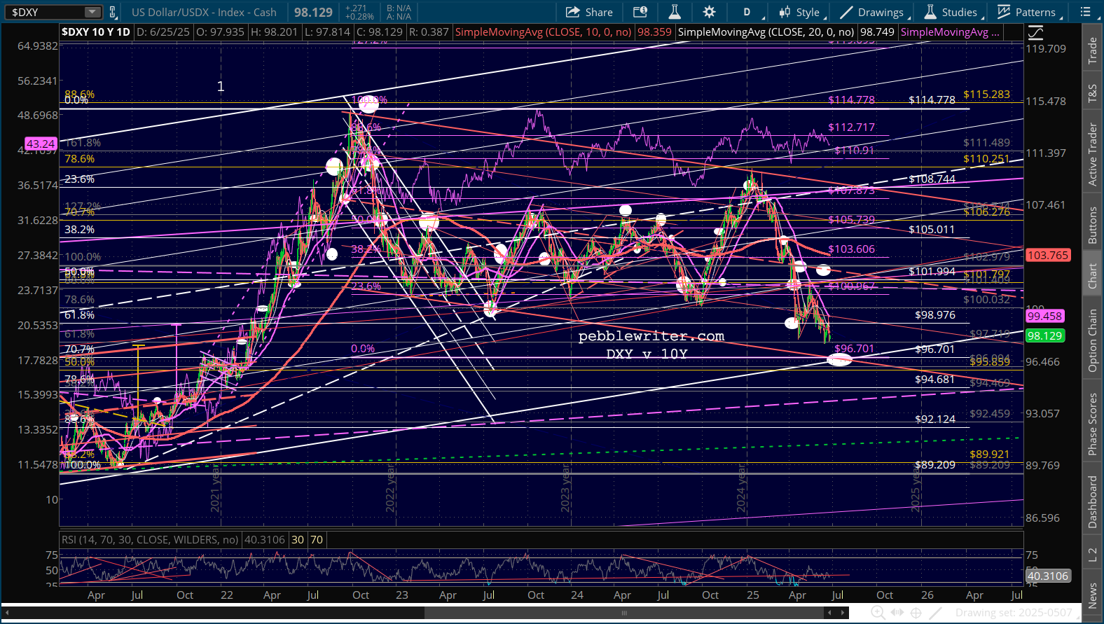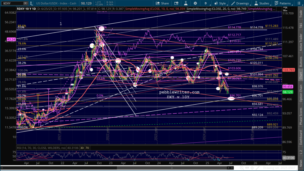 The interesting thing about DXY is how it has made lower lows while the 10Y has not. Assuming that DXY continues falling to 96.70, we would expect the 10Y to fall to at least 3.93, but ideally 36.14 – a challenge unless inflation or the equity market collapses.