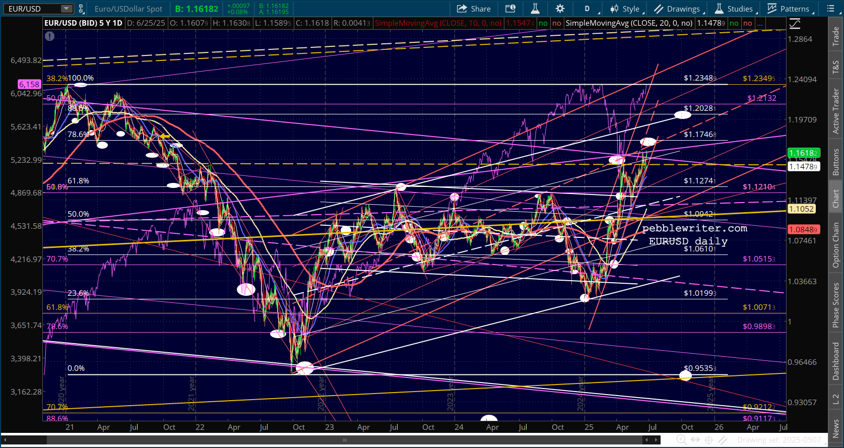 If the DXY is to dip a little further and rebound, it would imply that the EURUSD would rise a little further and then decline and/or the USDJPY would drop a little more and then rise. The EURUSD chart shows a clear path to the .786 Fib at 1.1746, followed by a slightly murkier path to the .886 at 1.2028.