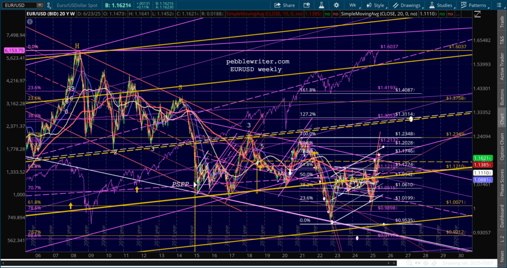 If the DXY breaks down, then the EURUSD has good long term potential to the 1.272 at 1.3114, but the timing could be quite long term, as late as 2028. AS the weekly chart below shows, EURUSD has already broken out of the falling purple channel.