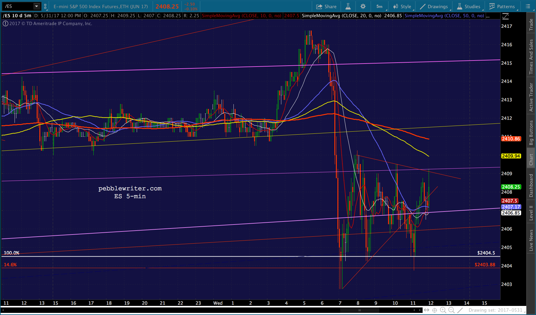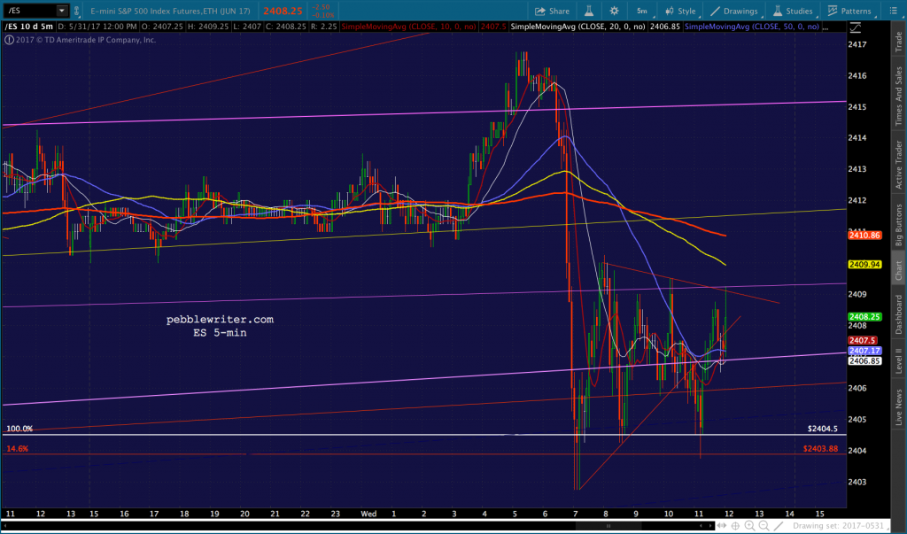 Probably not a bad place to call it a day, though a big dump by VIX into the close (10.25ish) could get SPX up to the SMA5 200 (two more points to 2412ish) or back to green at 2412.88. Note that ES has run into TL resistance, and has roughly the same distance up to its own SMA5 200.