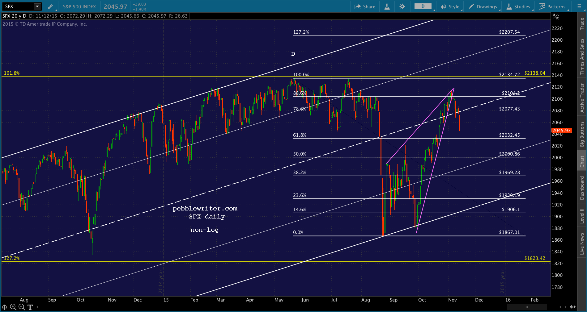 If it doesn’t, there are plenty of other lower targets to consider: lots of Fib levels and moving averages that were ignored on the way up. And, way down at 1867, the midline of the large purple channel from 2009 is slowly coming into view.