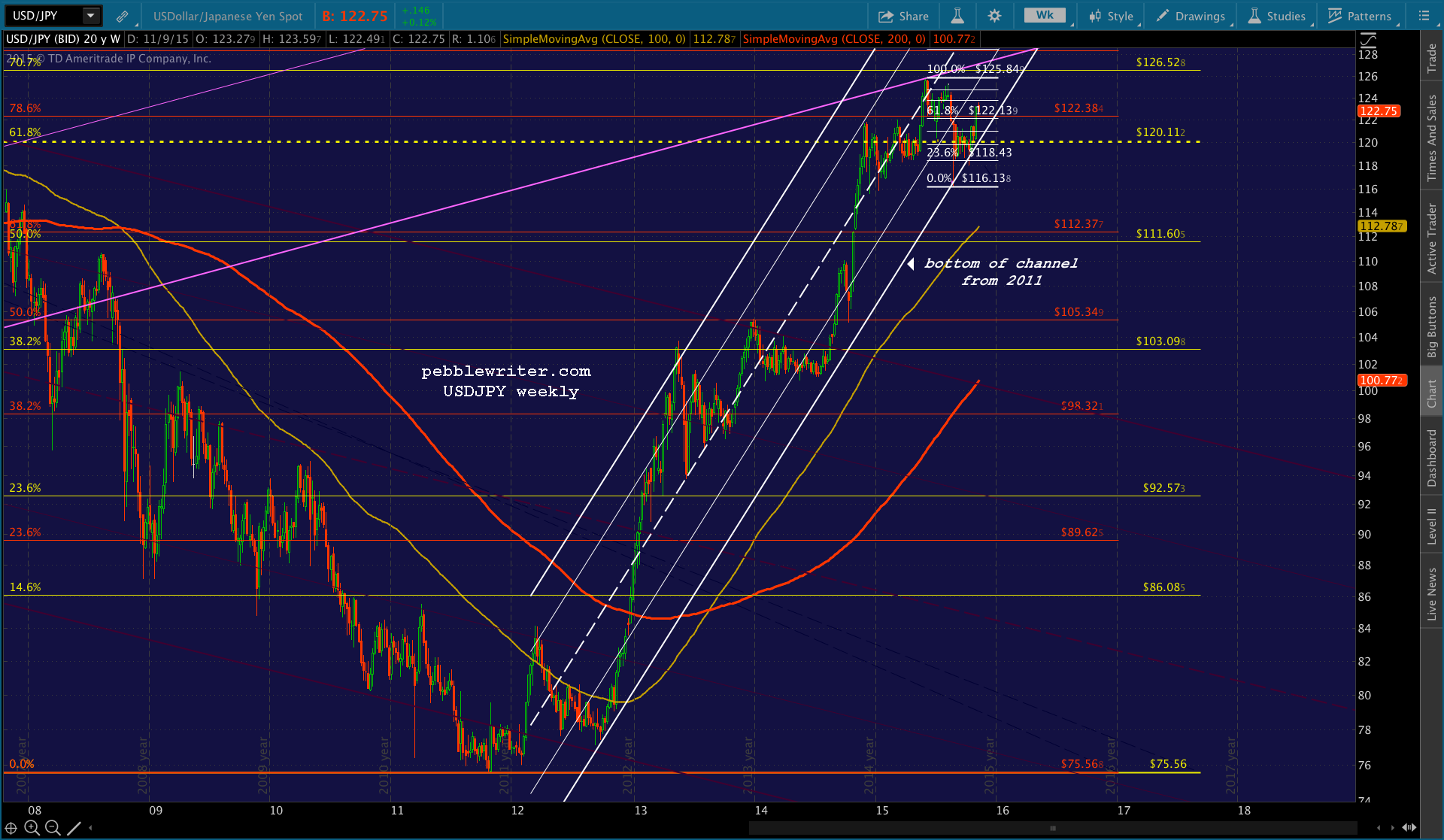 When SPX hit 1867, USDJPY hit the bottom of the channel that’s guided it higher ever since 75.56 in 2011 to its current 122 — a 62% moon shot that made the yen carry trade the most important carry trade on the planet.