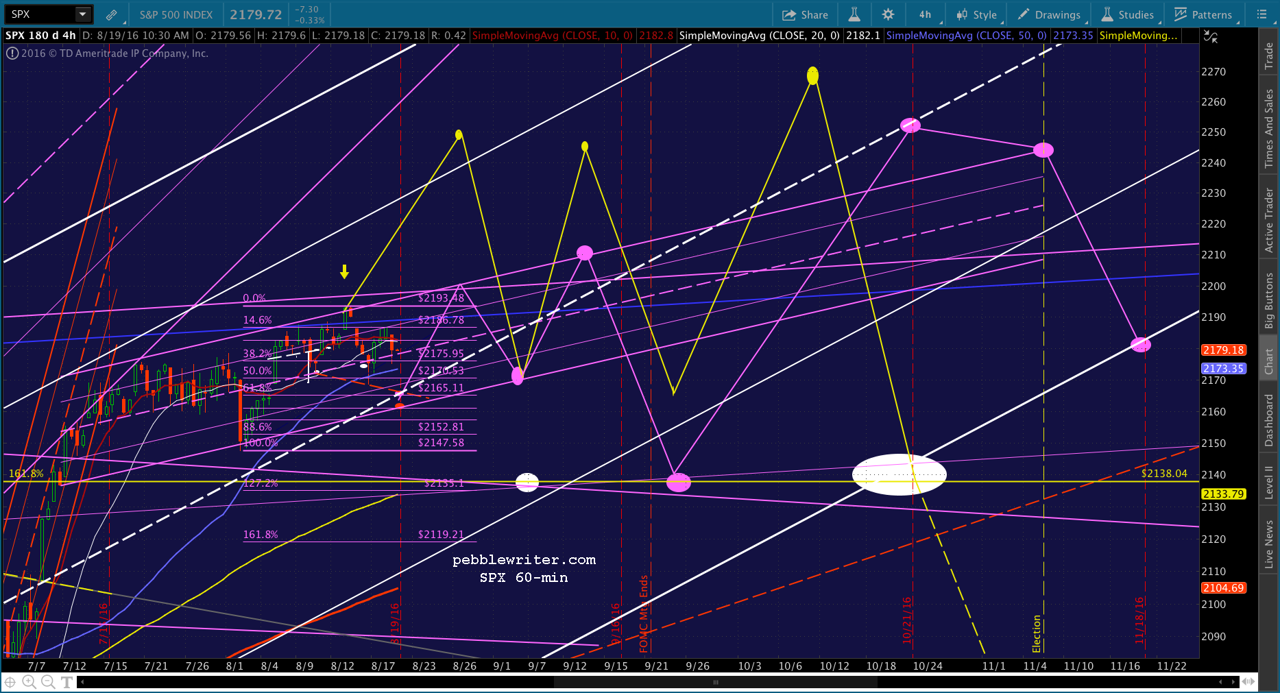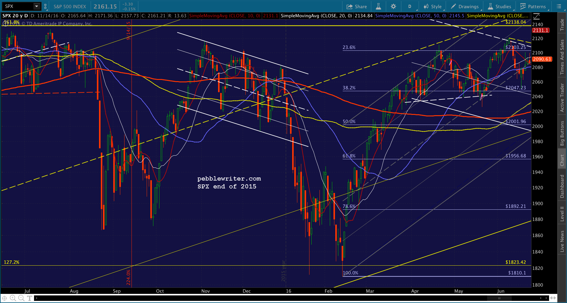 Quick update on today’s action so far — a triangle that I imagine will resolve to the downside, backtesting the white channel we just broke out of. Looks like 2146 by tomorrow, and potentially a little lower next week. But, I continue to believe it’ll happen when the SMA10 (currently 2131.39, up from 2127.59 Friday) clears the channel top. Remember, the SMA100 (currently at 2149.33) could get in the way.