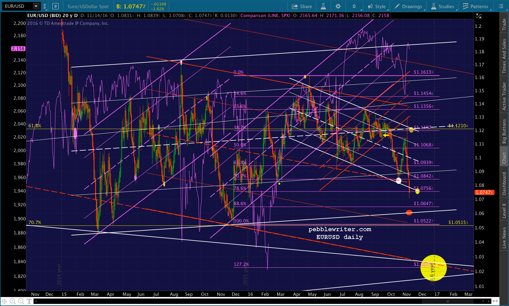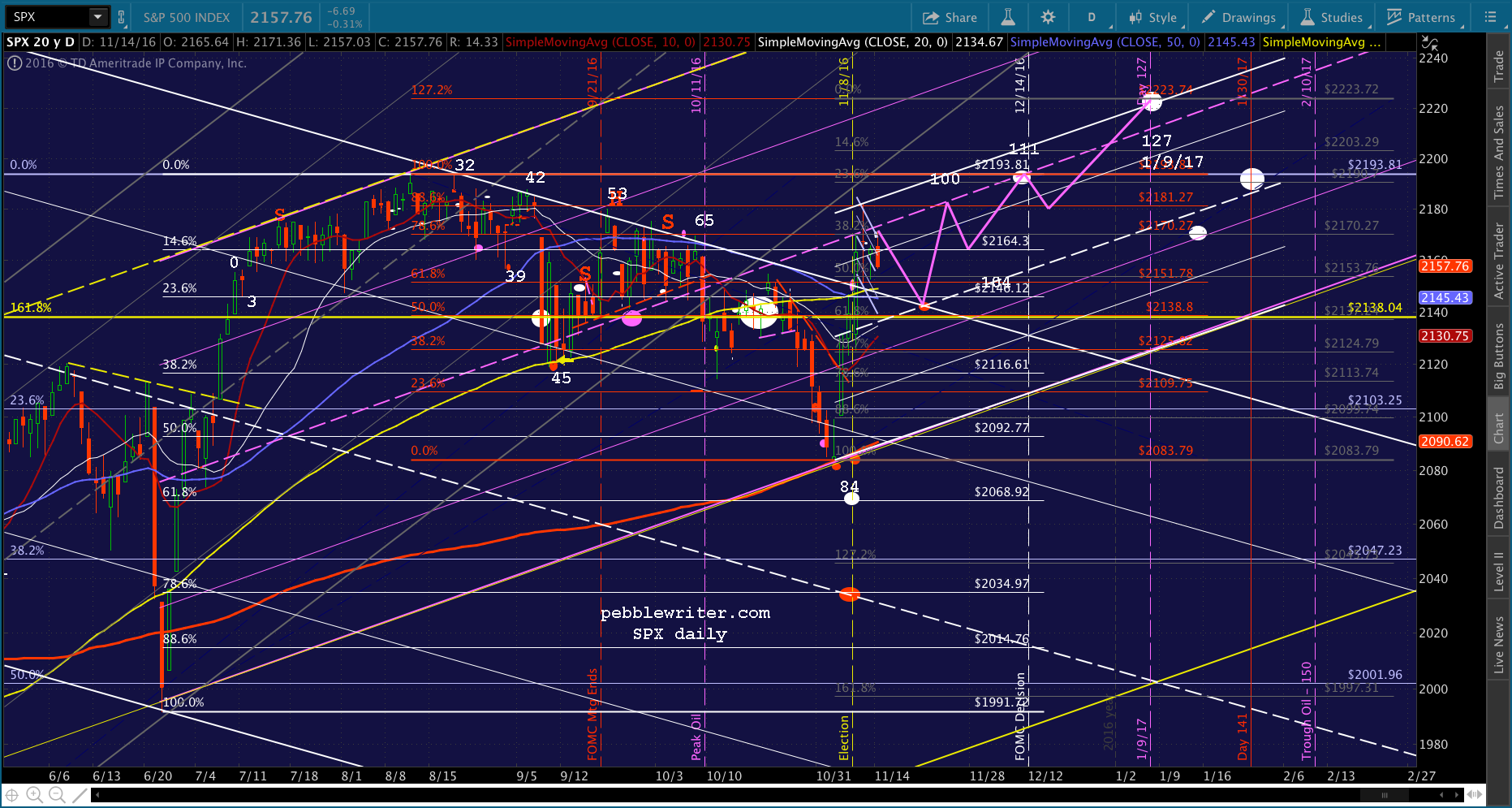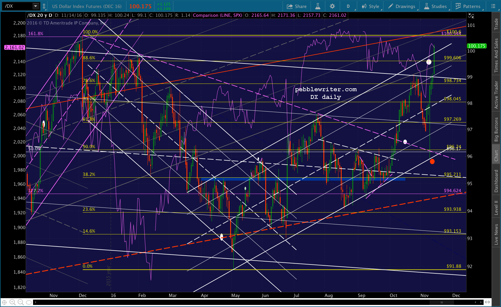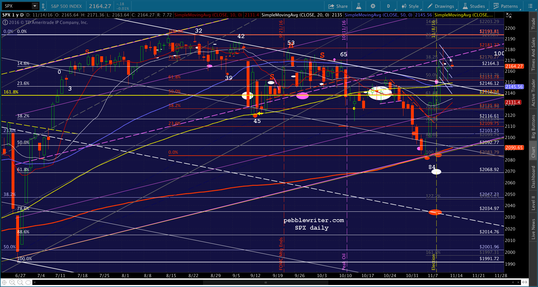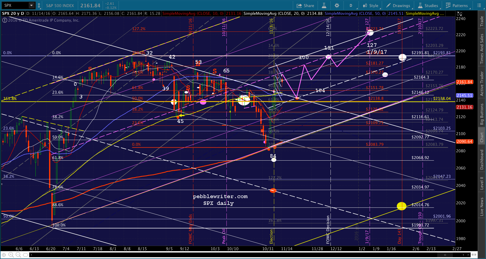 We all know what happened next. Hillary didn’t win, and ES plummeted 115 points off the Nov 7 highs. Had ES held those losses overnight, this would have put SPX at 2031 — 3 points away from the red target at 2034.97 — the falling white channel midline and the .786 retracement of the post-Brexit ramp job. It would have happened on Nov 9 — also known as day 87, which would have been one day off from the 2007 pattern.
