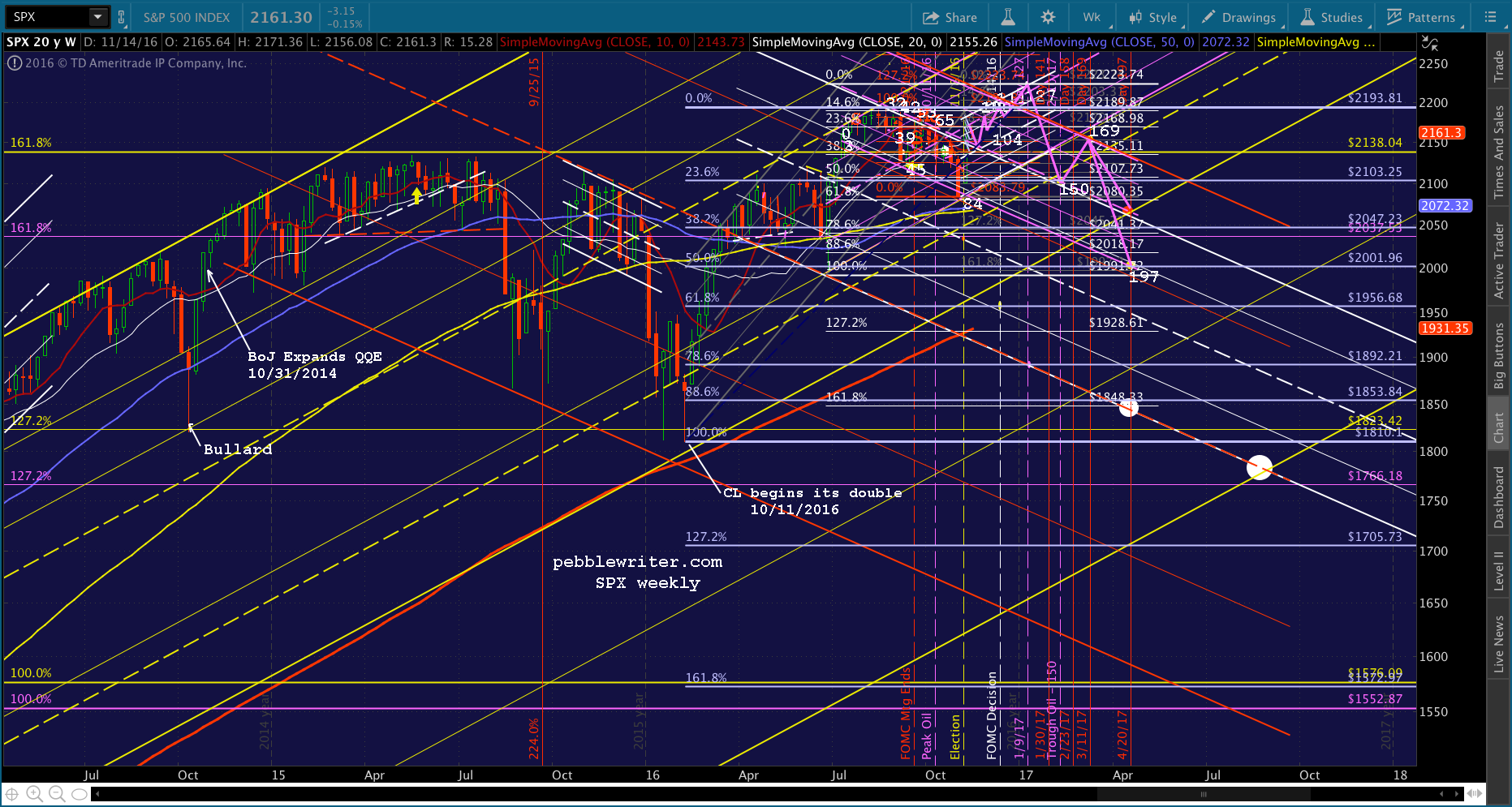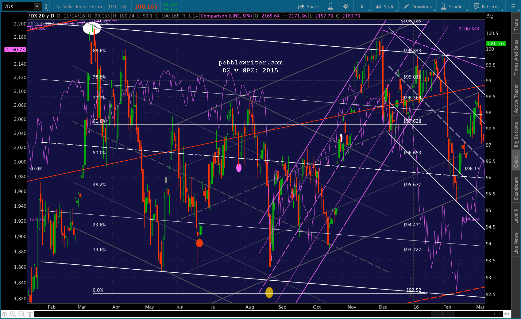 If 2016 were to follow the same path, we’d see day 127 at 2226 — close enough to the red 1.272 at 2223.74 in my book — but, a bigger selloff in keeping with the resulting falling purple channel to 2100 (purple midline and gray .886) when oil bottoms out around Feb 10 and either 2063 or 2000 around Day 197 on Apr 20.