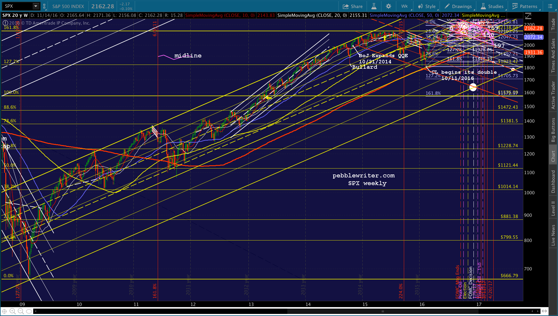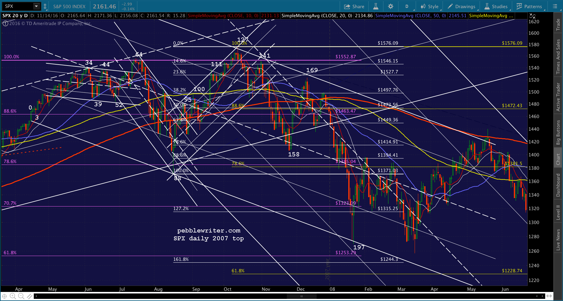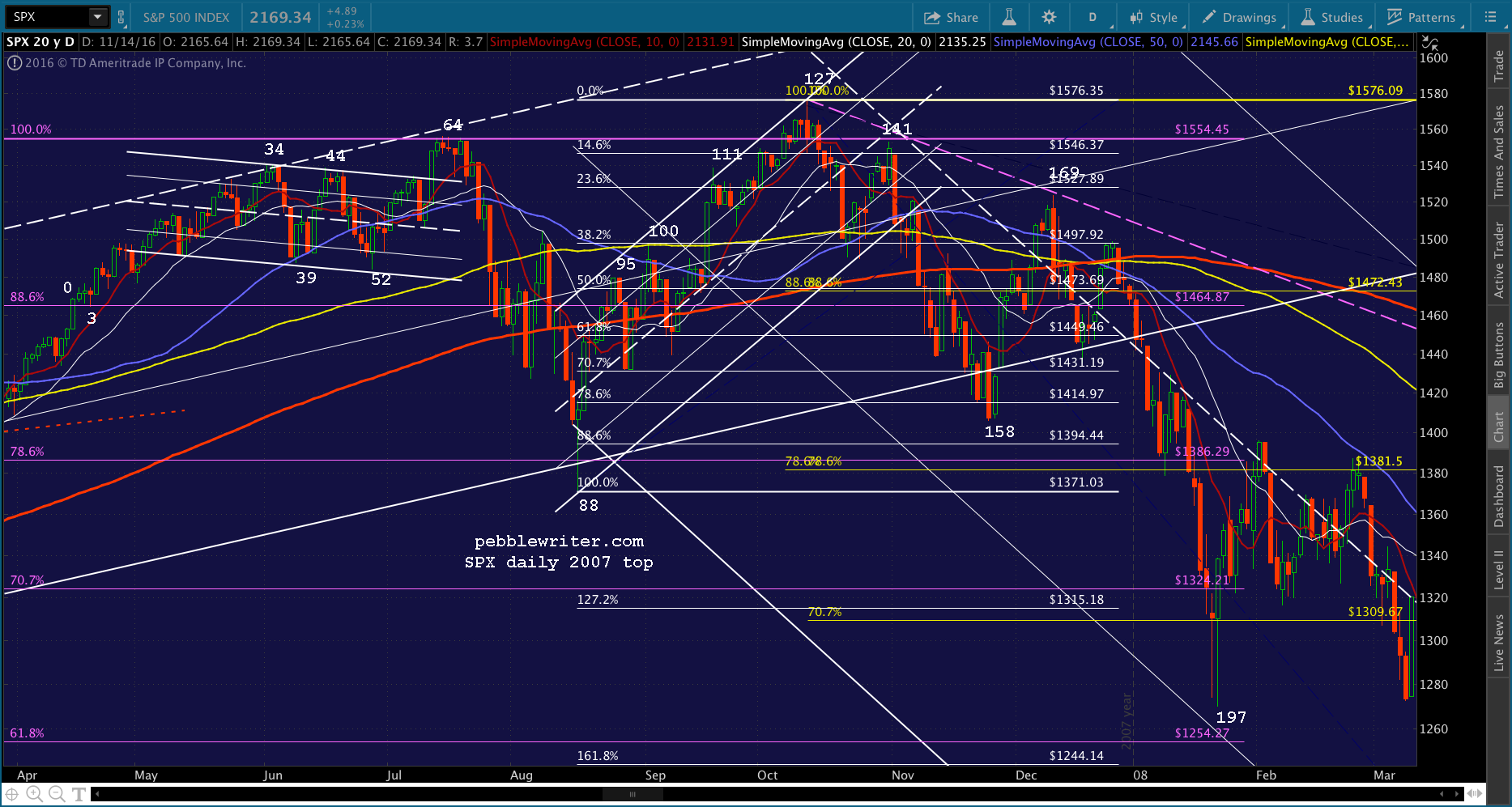 If you want to consider an “apocalyptic” angle, it gets much worse. Consider what the 2007 top at 1576.09 represented: an effort to top the 2000 high of 1552.87. It did, by all of 23.22 points — 1.5%. In the process, it created a falling white channel that started at the point at which it exceeded the .886 and tied in Days 88 and 197 on the downside, the Days 127 and 169 on the upside, and enough midline tags (especially Day 158) to look legit.