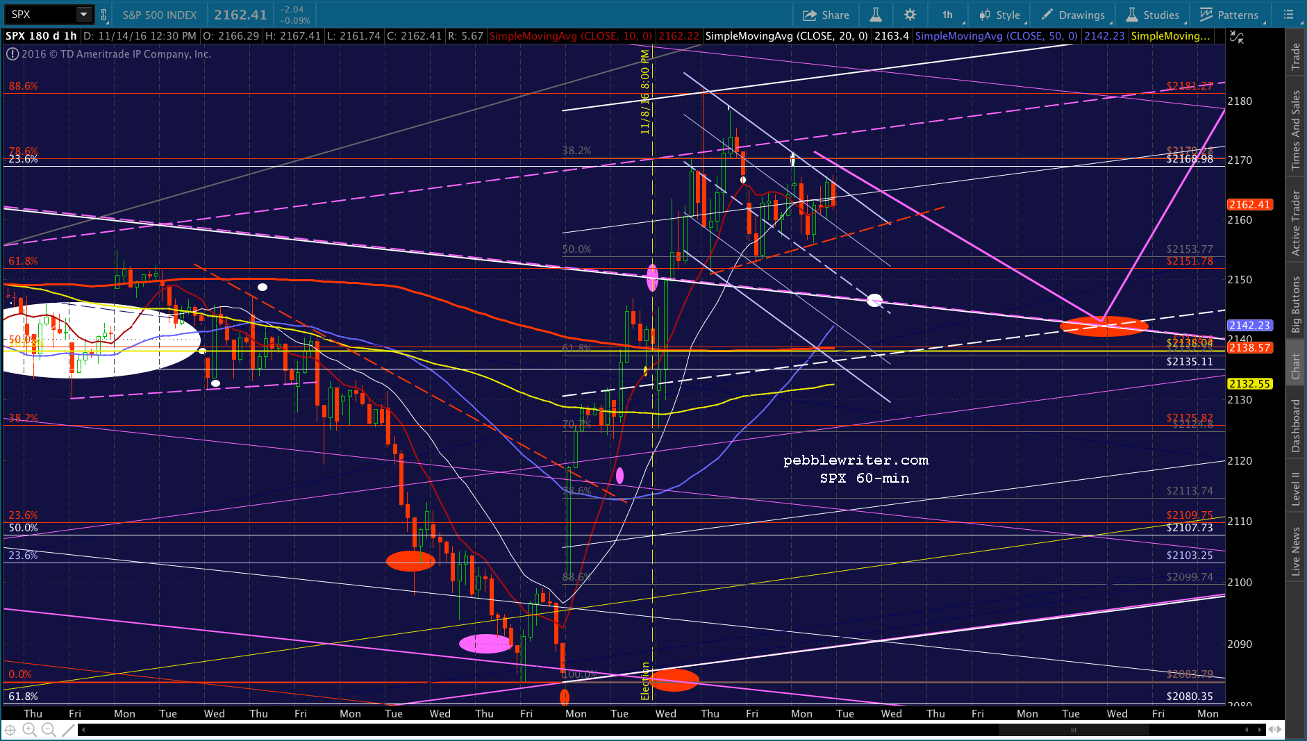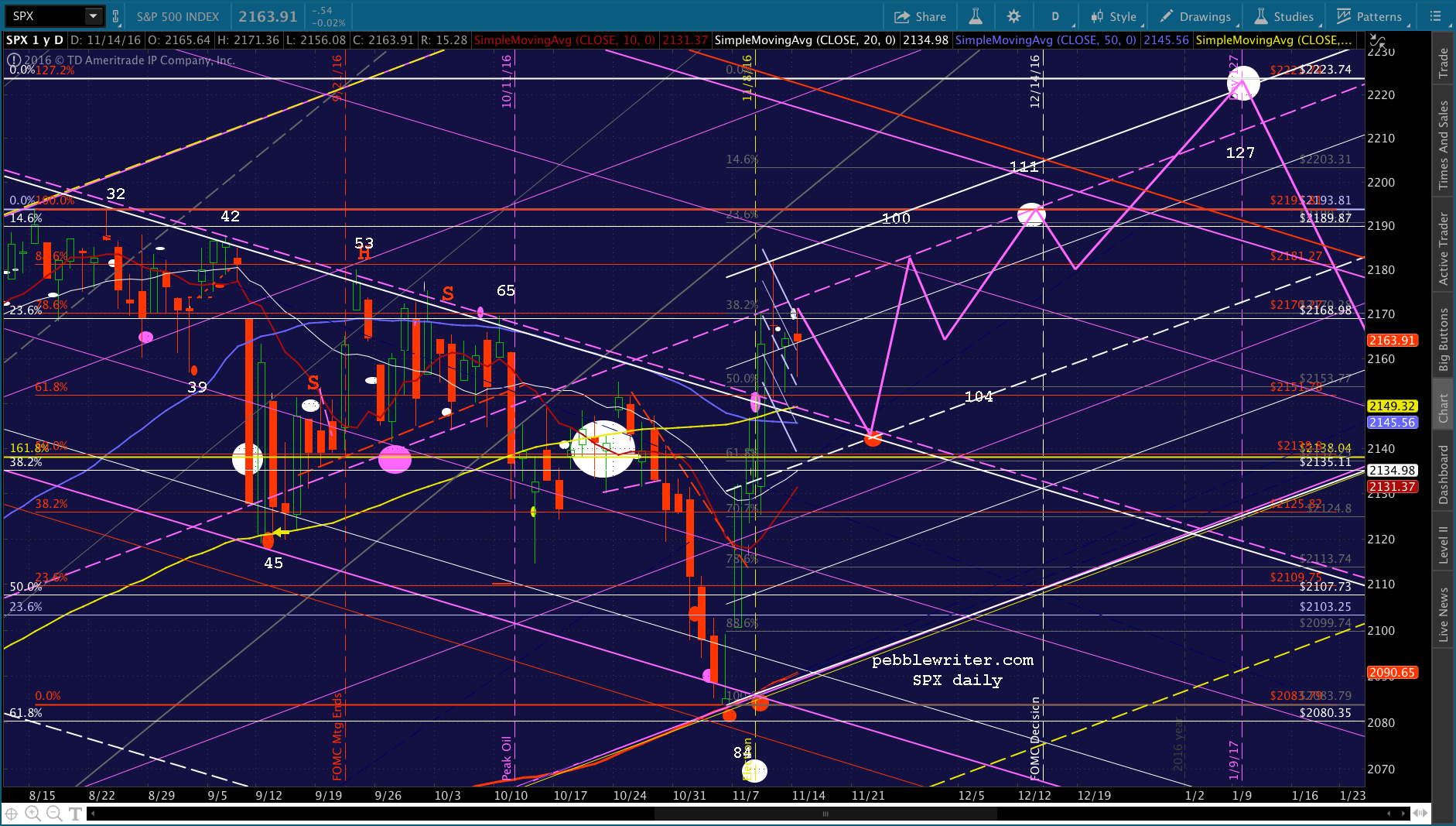 We continue to need a solid backtest on the falling white channel — which is probably going to happen today or tomorrow at 2146-2148. But, if the analog is to play out well, it would continue dropping to 2138-2142 until Nov 22 and then start edging higher. Something like this: