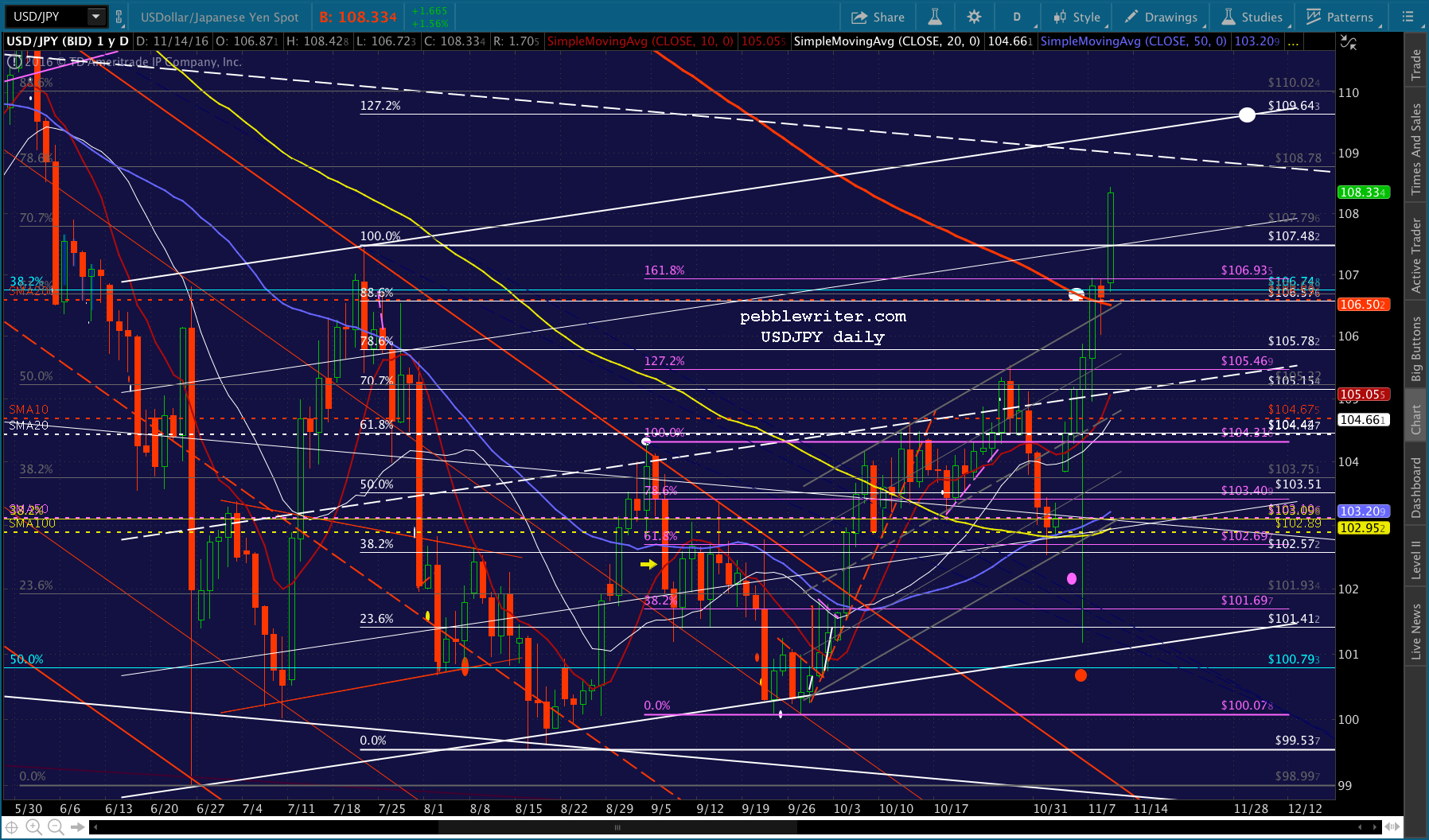 But, on Sep 6, USDJPY fell back through its SMA10 and was heading back toward the bottom of its Flag Pattern established in the wake of Brexit. As I recall, we had numerous Fed presidents giving interviews indicating they were highly likely to raise rates on Sep 21.