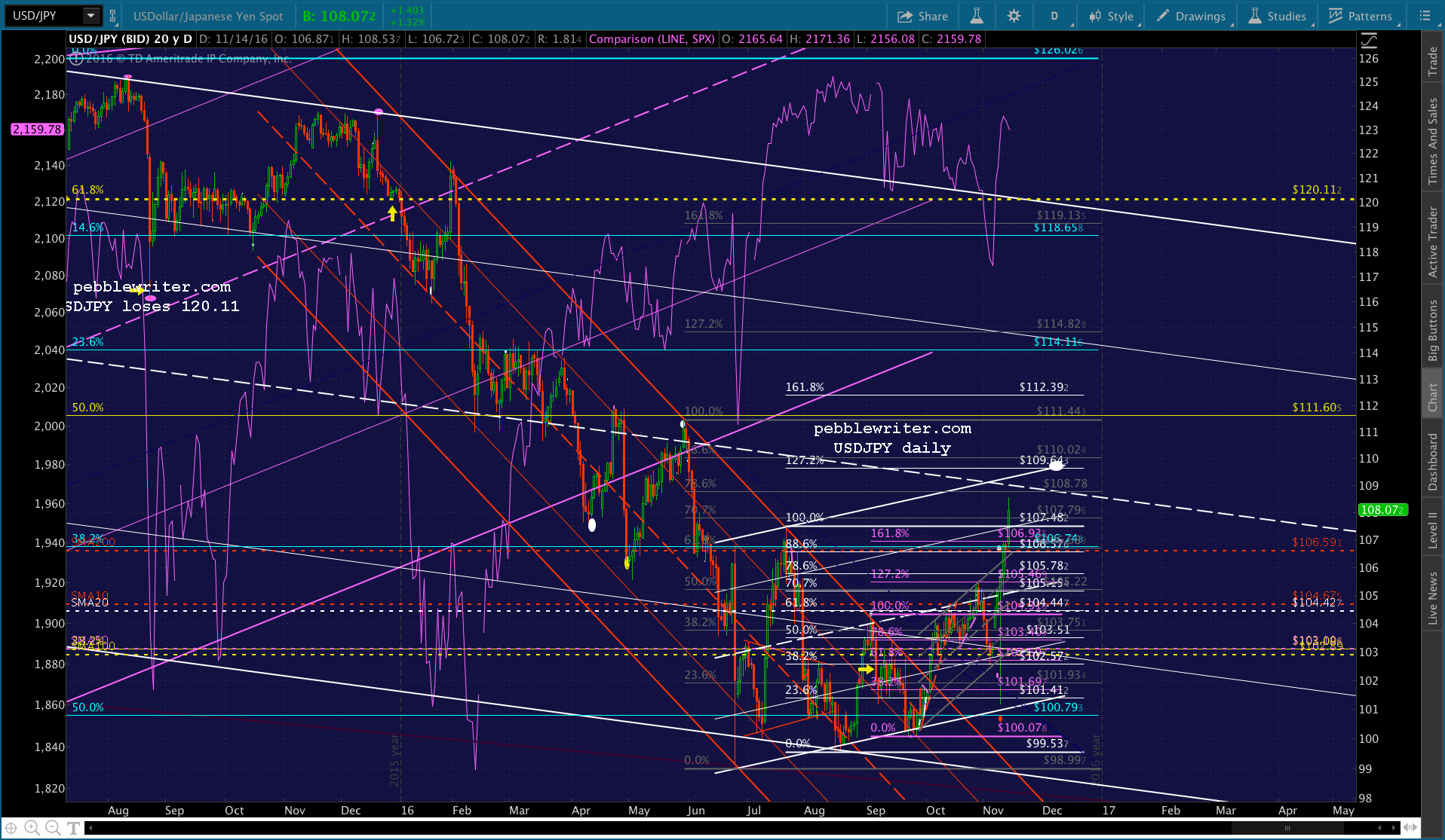 After that, things went pretty much according to plan. Day 88 in 2007 lined up nicely with day 84 in 2016. I think it’s fair to say SPX might have dropped a little further over the next few days if it hadn’t been stick-saved at its SMA200 (which is never actually reached, BTW.) The stick save came courtesy of USDJPY’s gap higher on Nov 7, in advance of the elections.