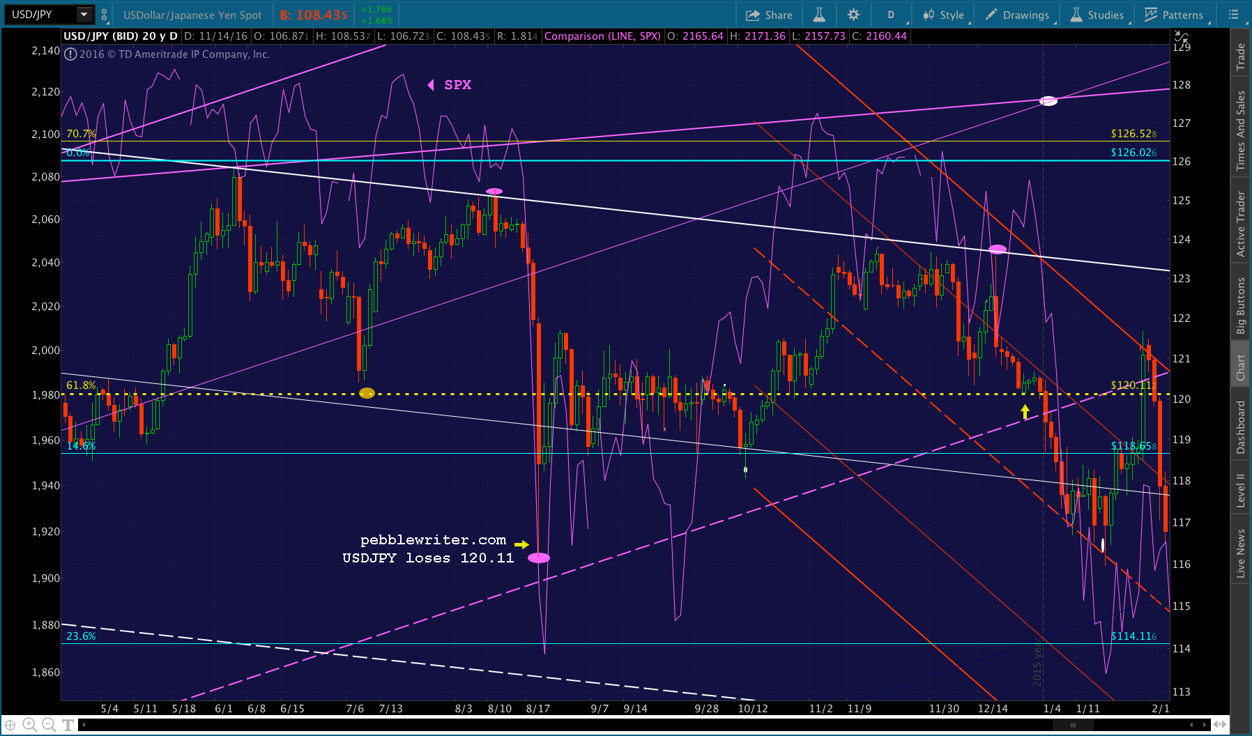 We have to go all the way back to Aug 2015 to see USDJPY make a similar move. After plunging through the 120.11 Fib level to 116.14, it rebounded 4.24 the next day. It precipitated a 265-pt drop in SPX that was only brought under control by USDJPY recovering to the 120.11 Fib and spending the next 4 1/2 months at or above it.