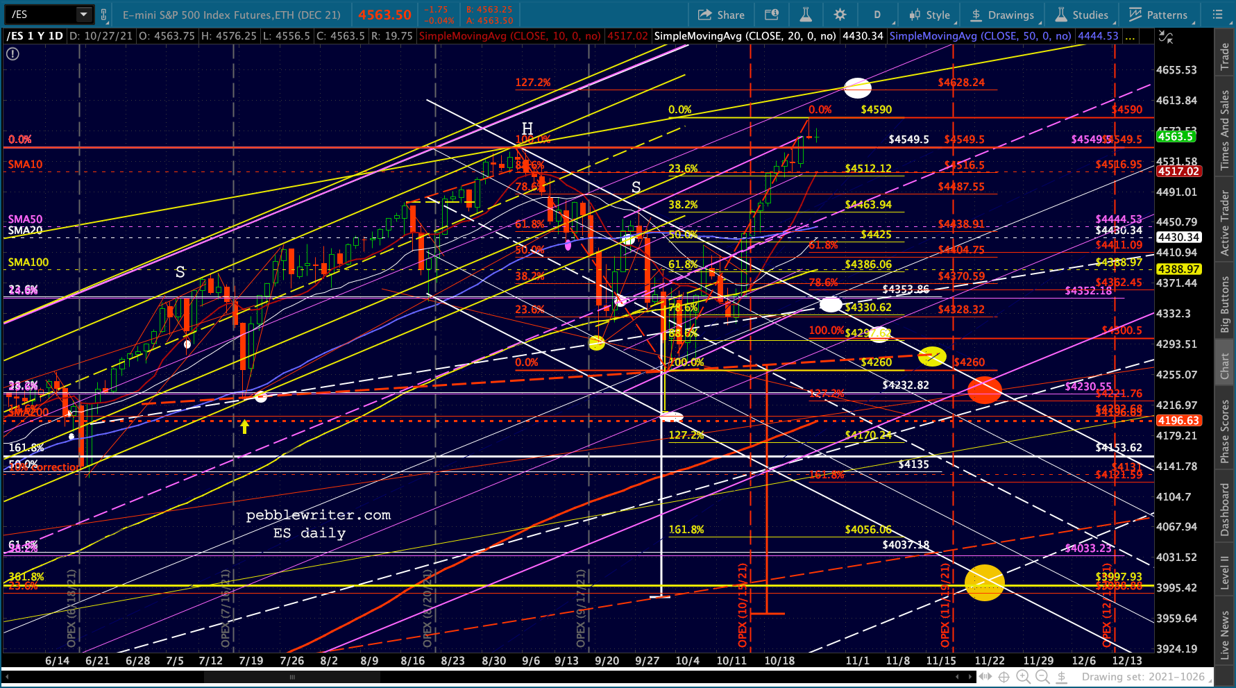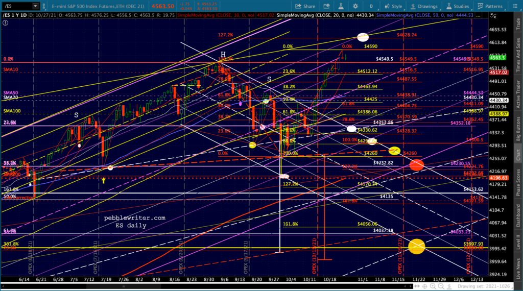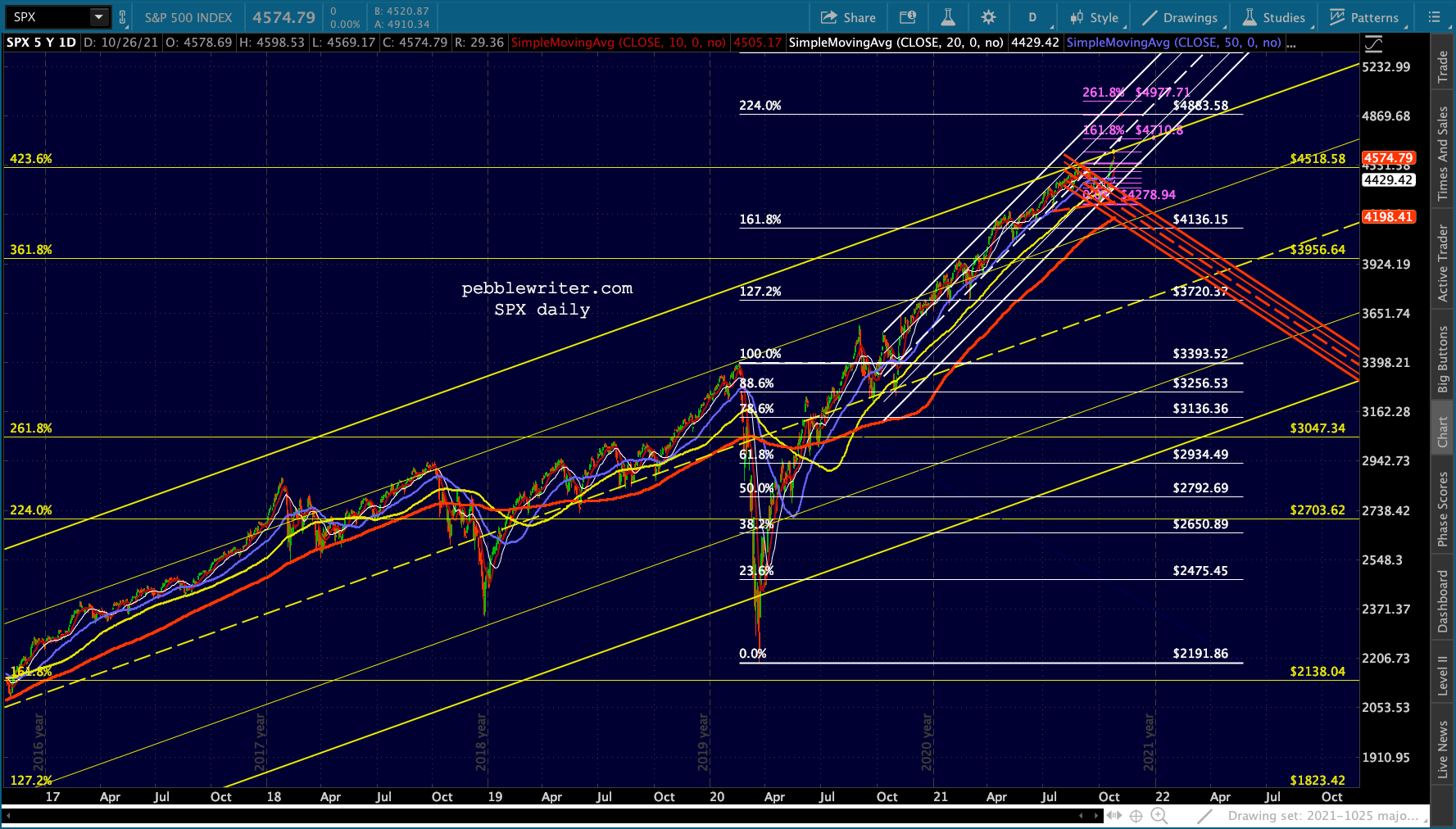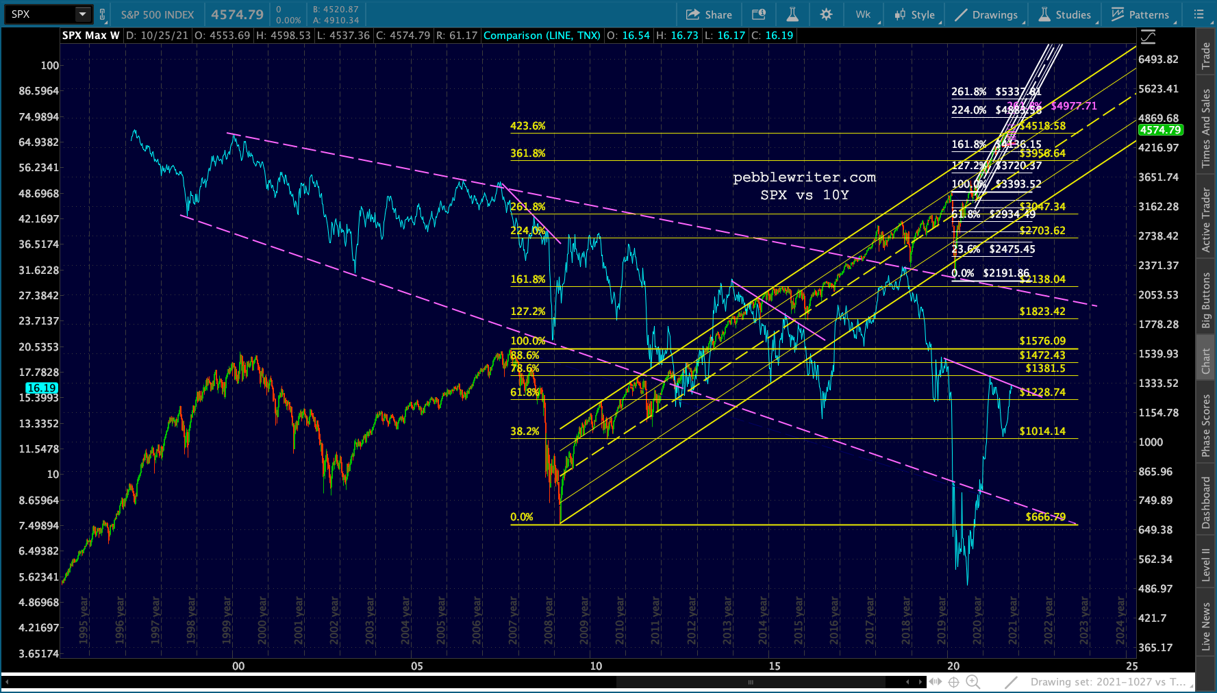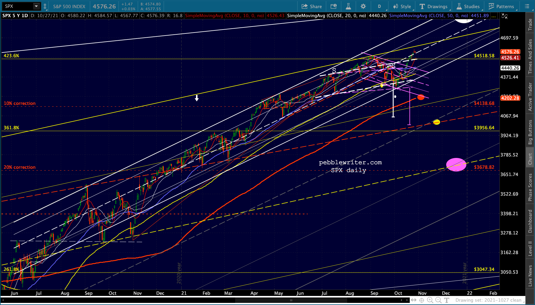 I suspect ES will top out around 4615 and SPX around 4596. A 10% correction in both would put them back at their 1.618 extensions (of the Feb-Mar 2020 drop) of 4153 and 4136 respectively. It would also likely result in the 10Y being knocked back to the .236 line of the rising purple channel at 1.08% or even the bottom at 0.92%.
