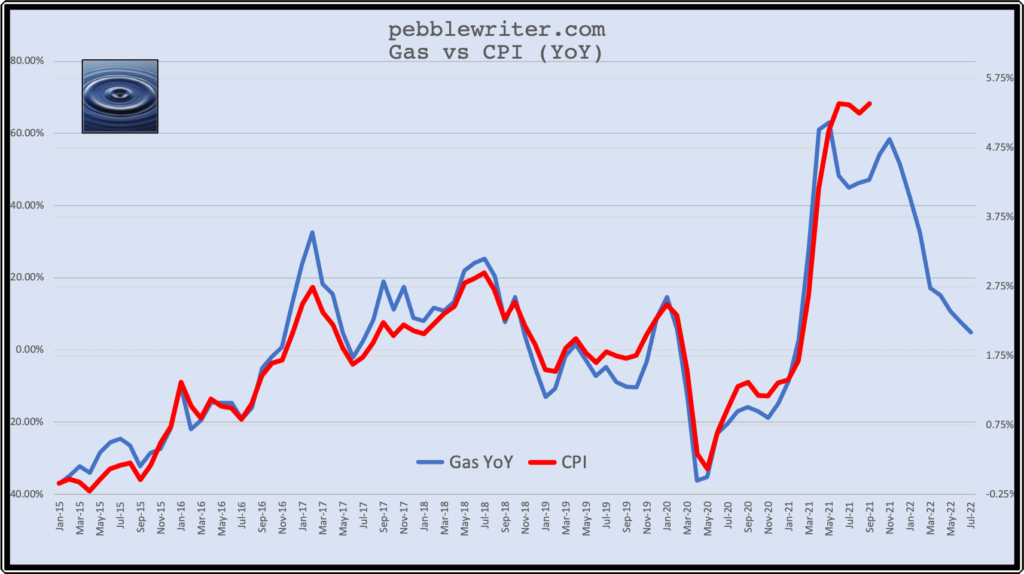 Now, gas prices have continued to climb. In Oct 2021, the YoY increase came in at 54.03% – near the Apr/May all-time highs. Unless gas prices drop dramatically in November, the YoY change will be over 58%. If prices were to remain flat through July, the YoY change would remain over 50% through December before finally tumbling lower.