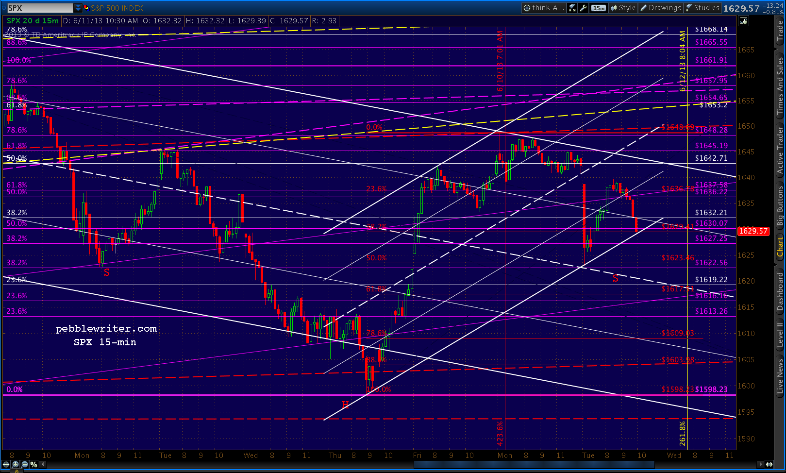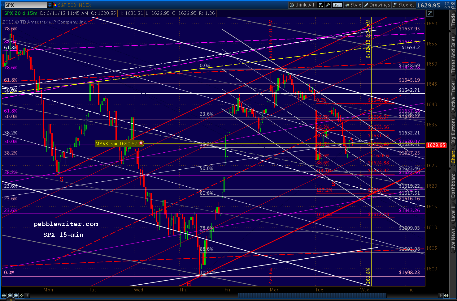 It’s a very confusing channel picture this morning. I would have expected a backtest of the broken white .25 line and purple .25 line intersection at the white .382 of 1632. But, the yen action overnight did a number on the equity markets, and SPX dipped much lower than expected on the opening.