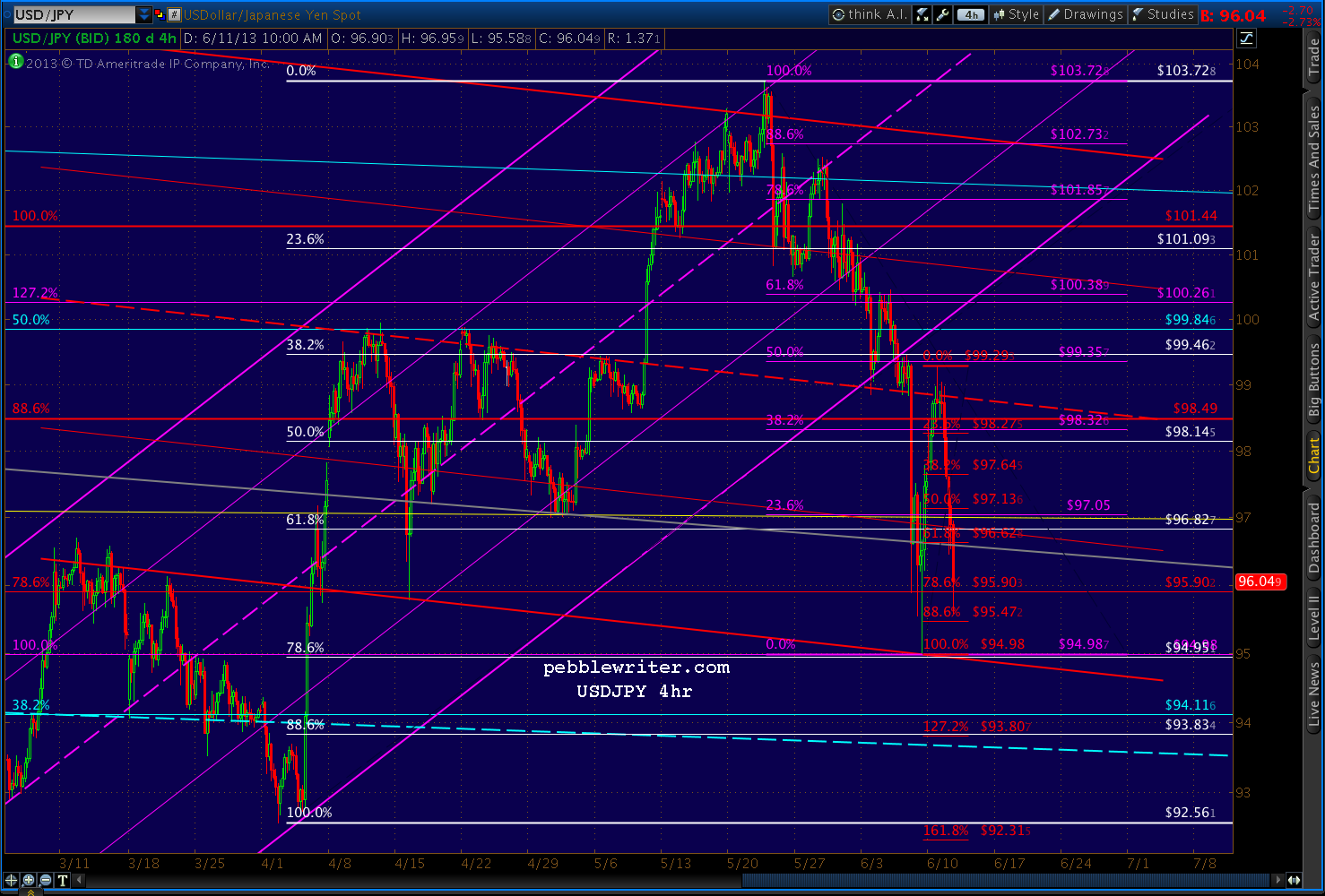 I have had June 13 earmarked as an important turning point for some time based on time Fibs. I assume it’s the .618 at 1653, but it could be the .786 at 1668 or .886 at 1677 (our original target.) If we lose key channel support, it could be an important low.