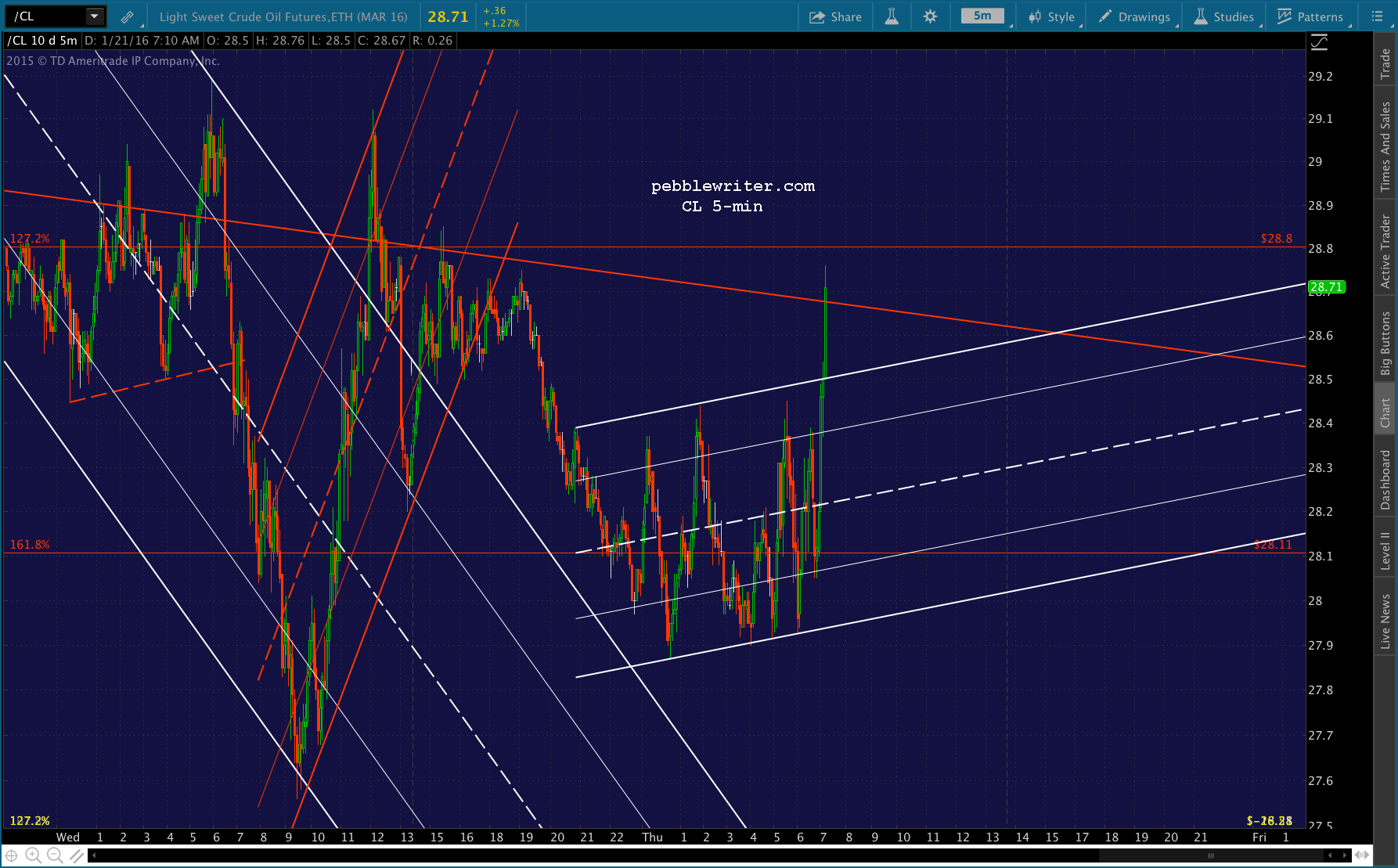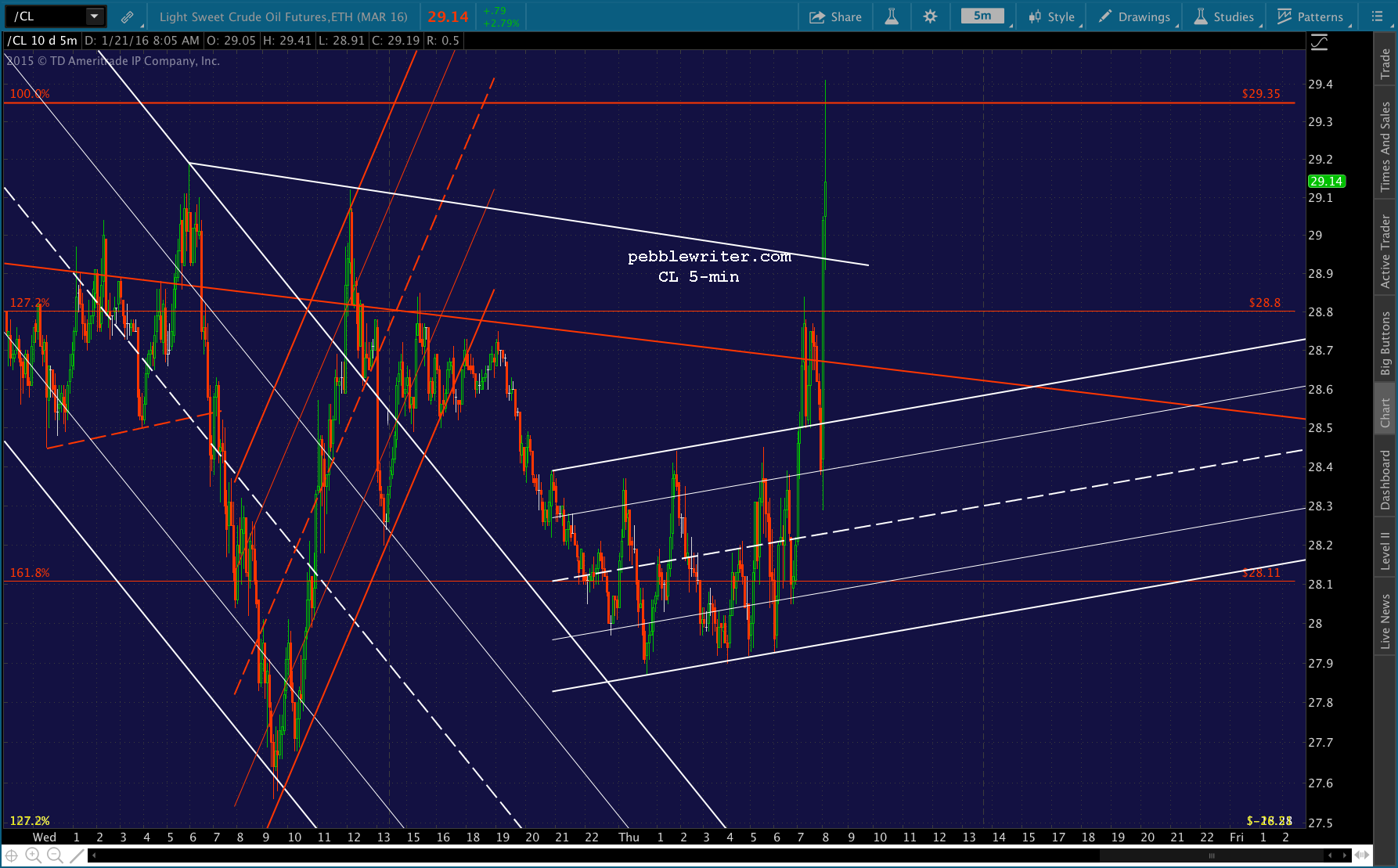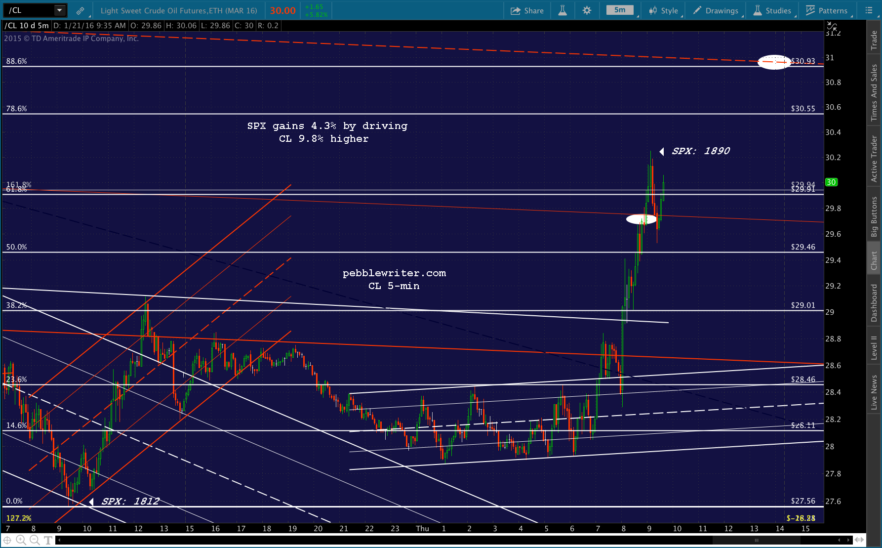 As I finish typing these words, CL just spurted up past its .618 and is back above 30. So, the whole premise of shorting here relies on it falling back and catching its breath. Stay tuned…