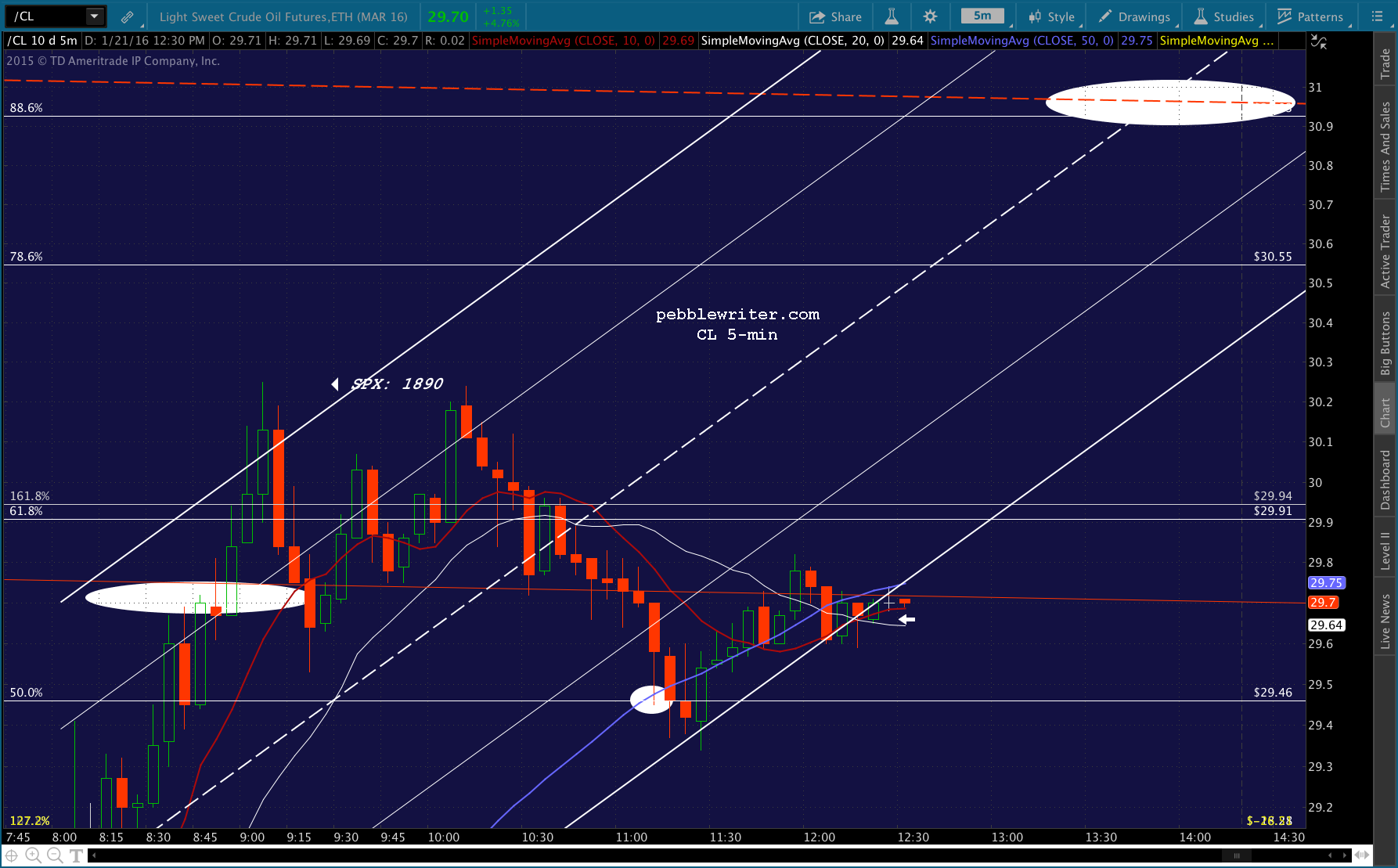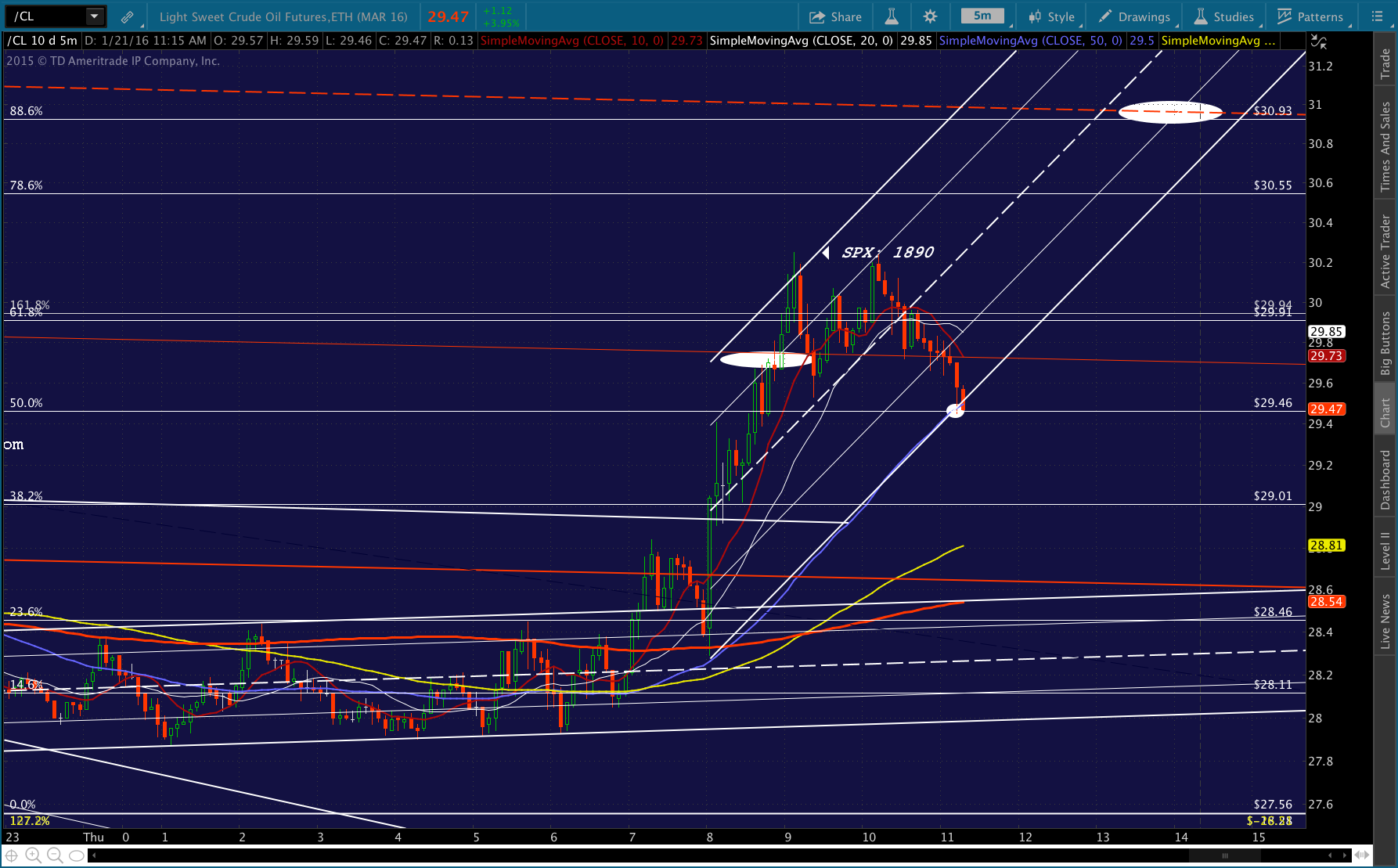 CL is pushing higher and USDJPY is about to break out of the white channel and jump up to tag the .886 at 117.86. I’d drop this long position fast if it dips below the SMA5 10, as it would likely be headed for the SMA5 20 now at 1880.73.