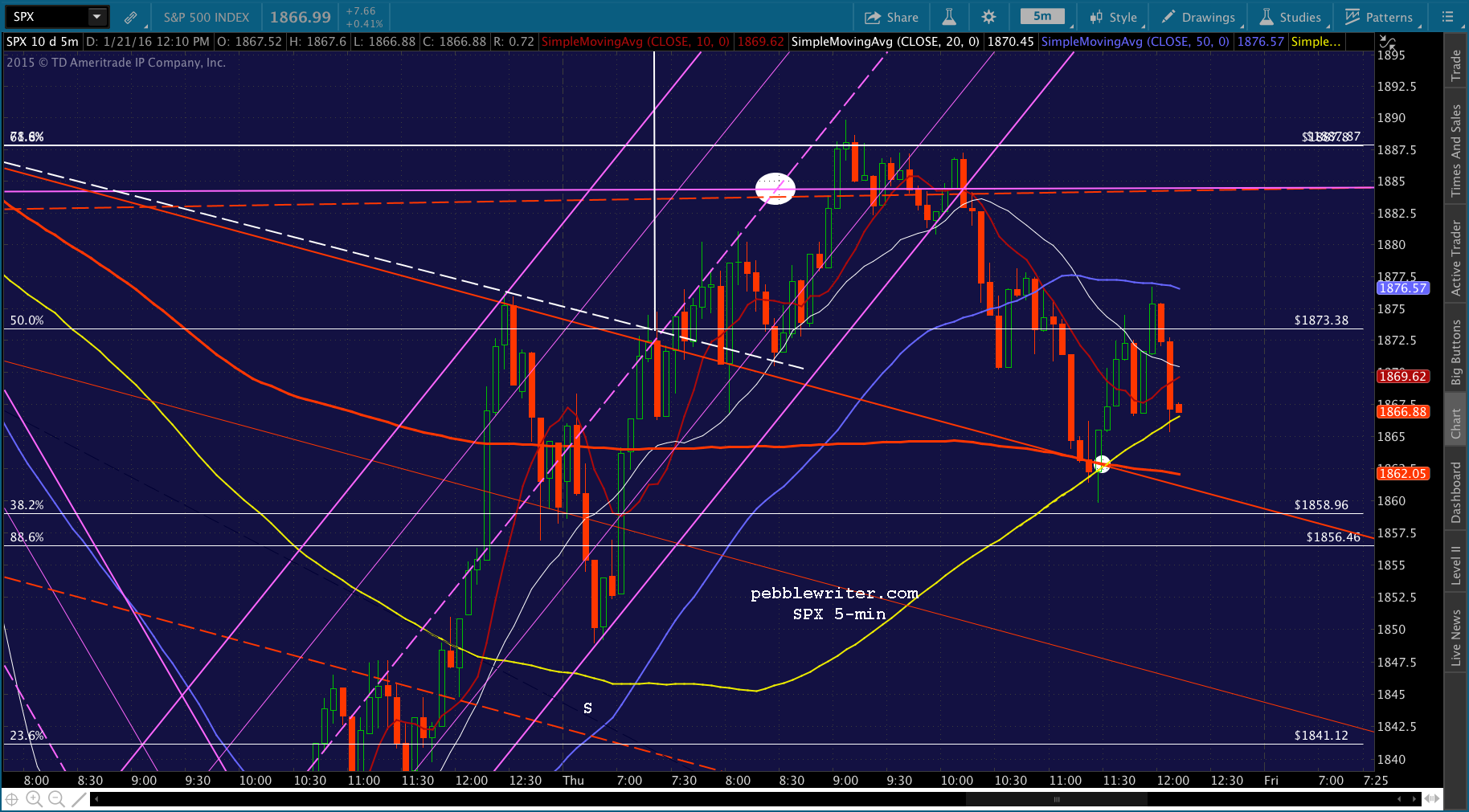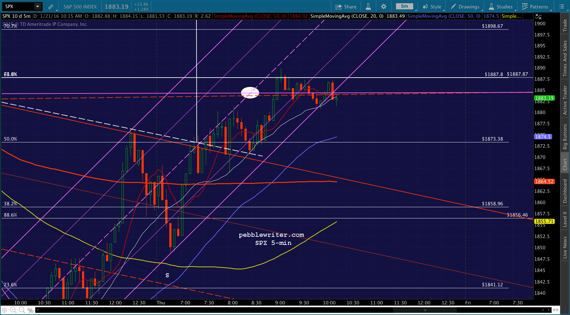 There’s the .500 Fib at 1873.38. Still have some momentum, so probably targeting the SMA5 200 at 1865ish – another backtest of the falling red channel?