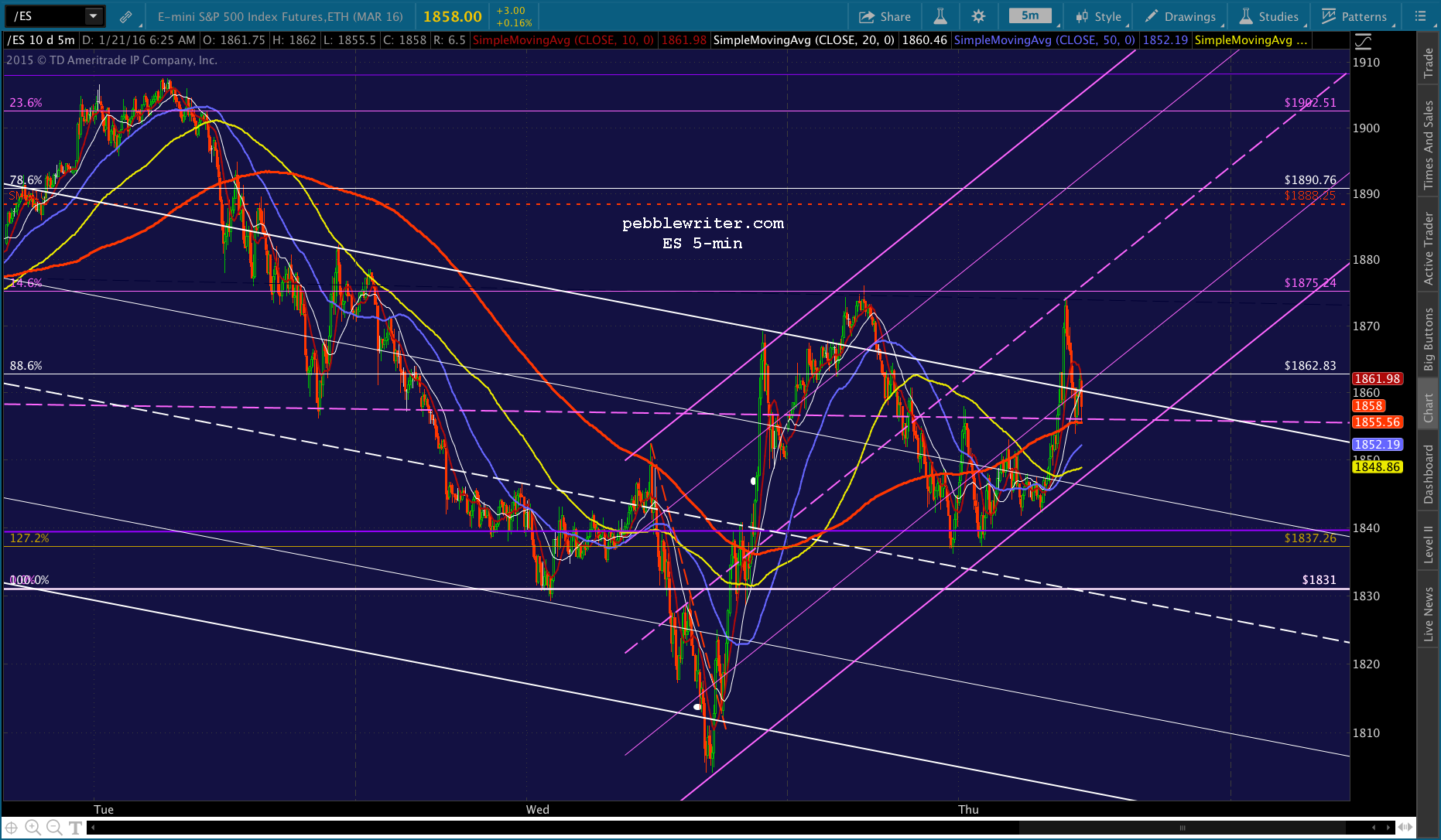 Even ES is doing some backtesting — of the white channel top and probably the SMAs around 1855.