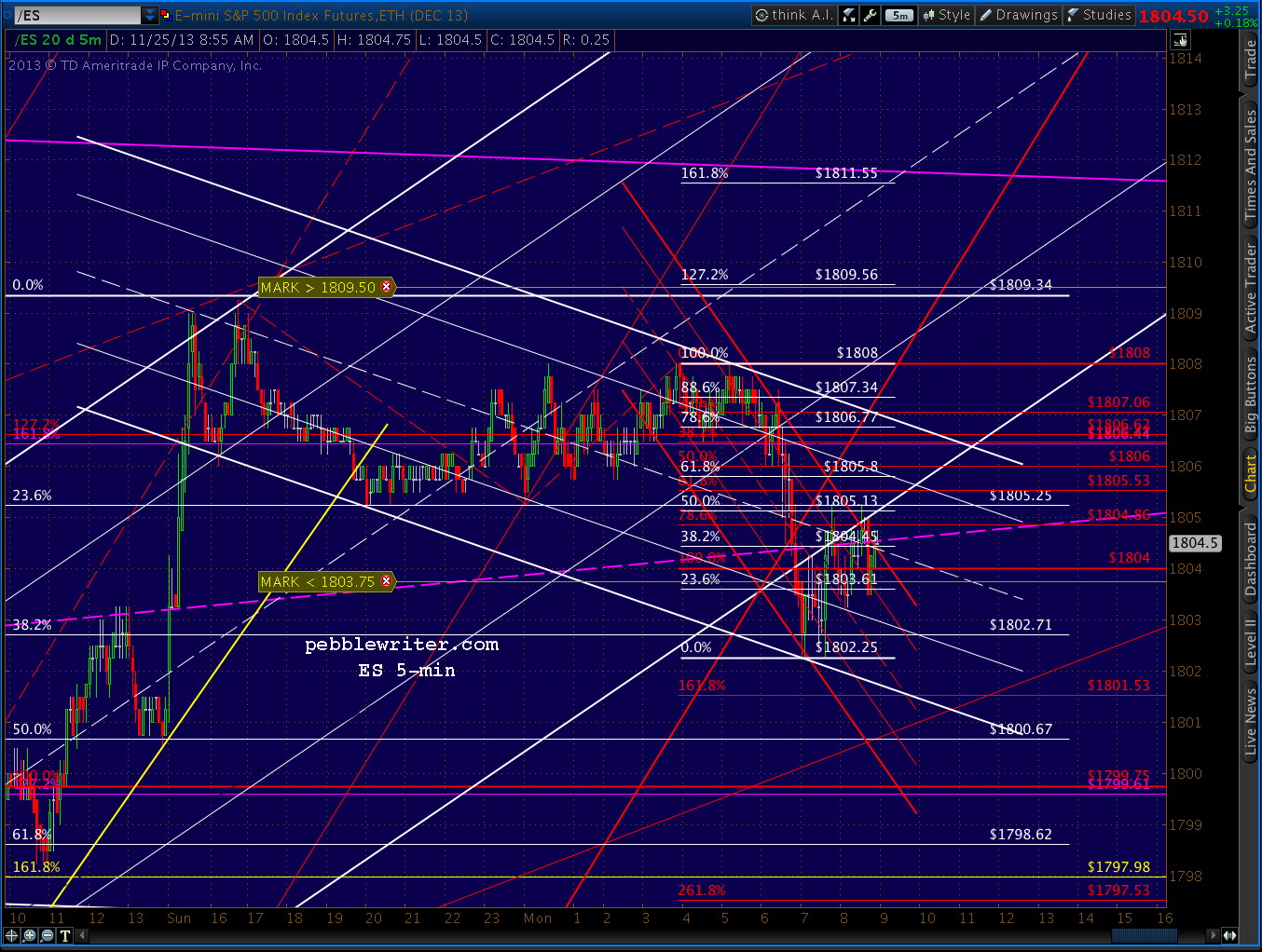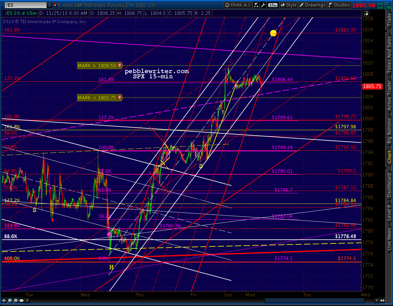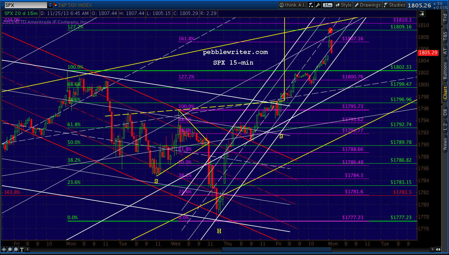 ES and SPX are a little out of sync. ES overshot the purple midline, and has been straddling it ever since — hinting at a backtest of the last minor top at 1800ish or the white .500 at 1800.67.